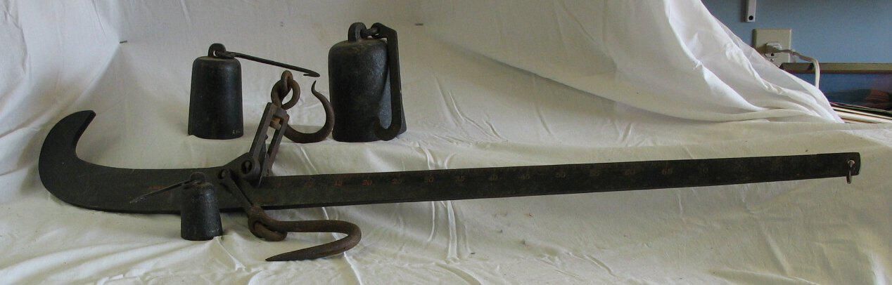 heavy-duty hanging scale, about three feet long, with three counter-weights