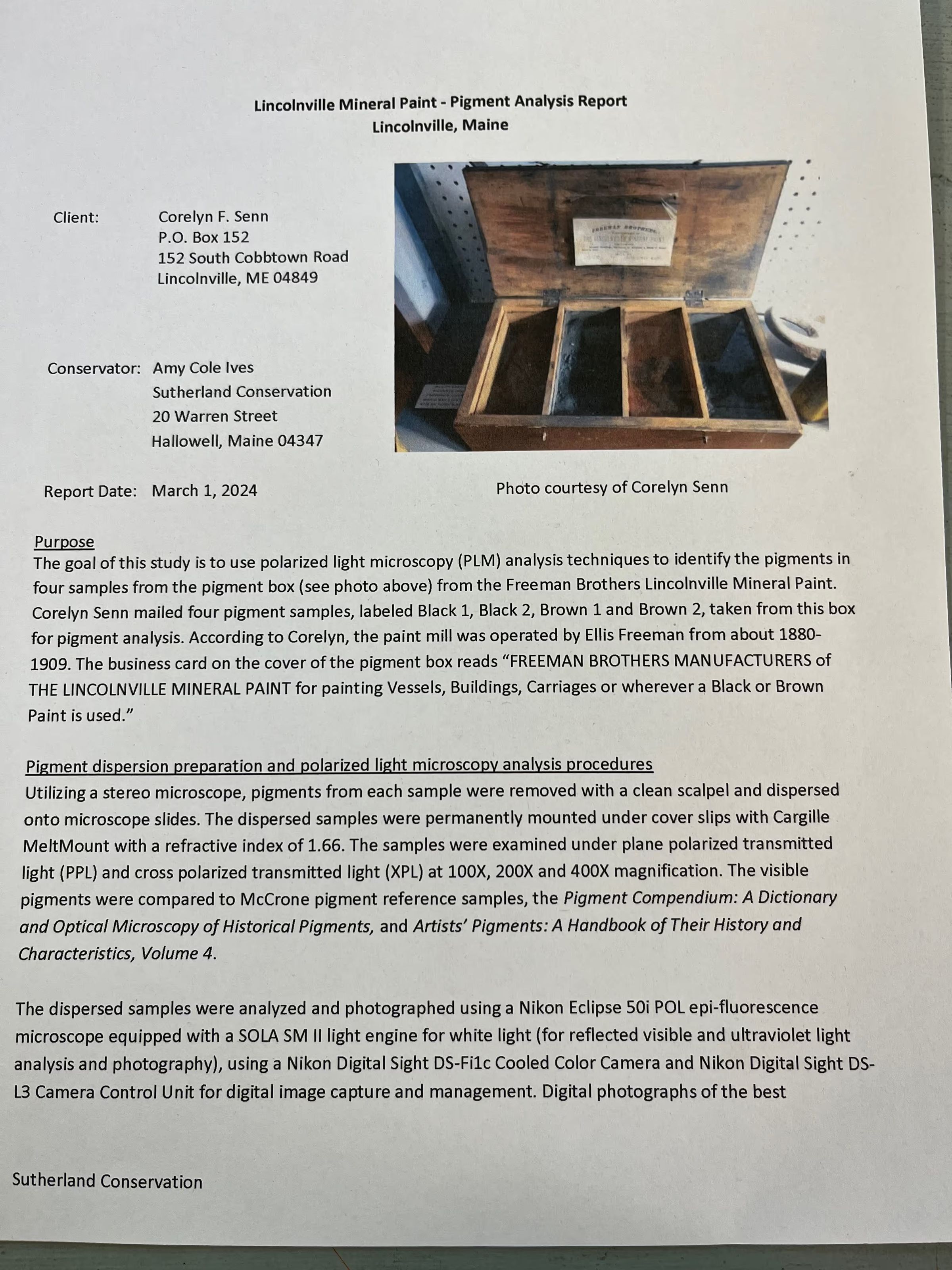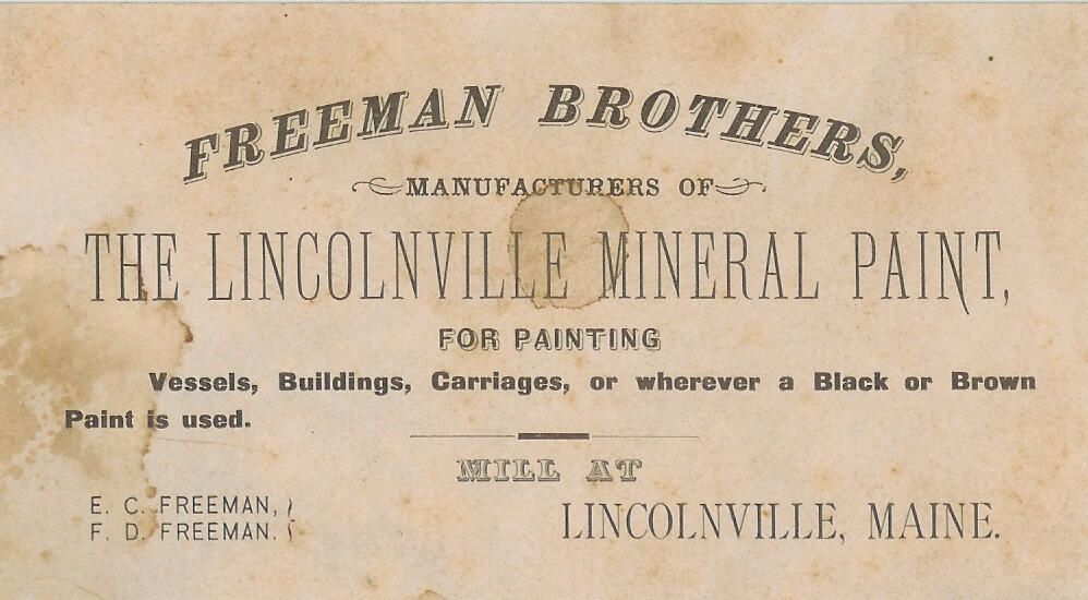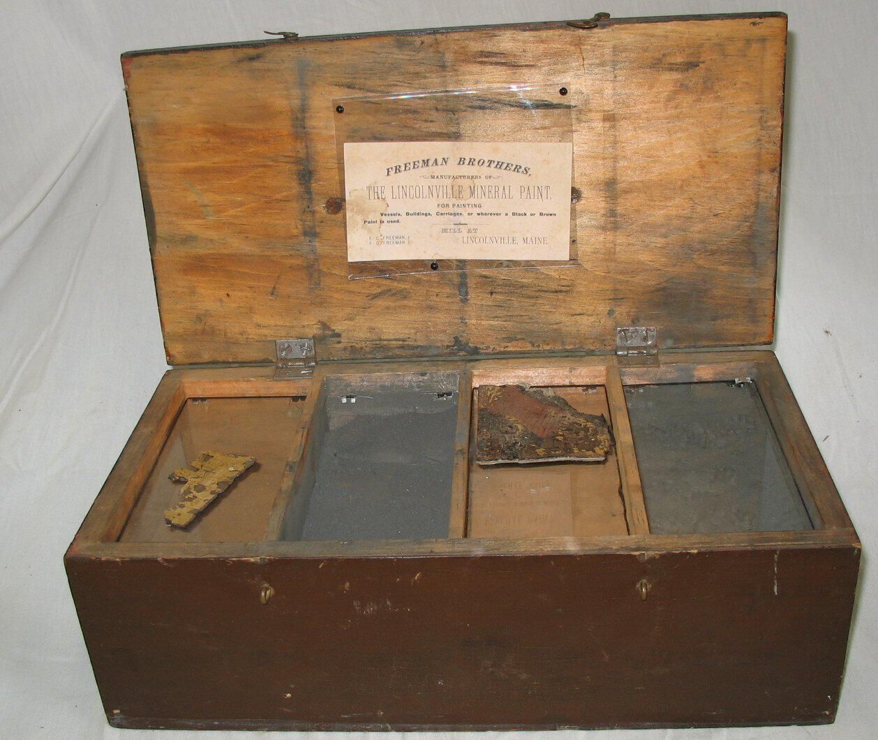 wooden box with hinged lid and handle, 15"x8"x4", inside four bays hold original paint pigments and a tag reading "Freeman Brothers manufacturers of The LIncolnvillus.e Mineral Paint for painting Vessels, Buildings, Carriages, or wherever a black or brown paint is used"