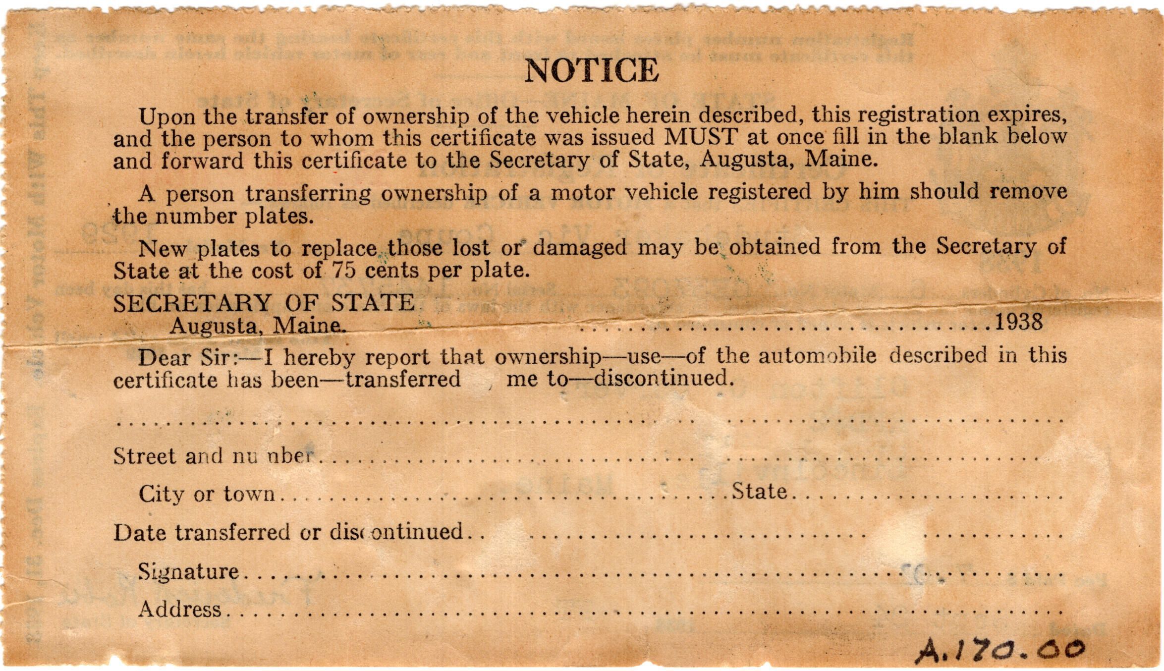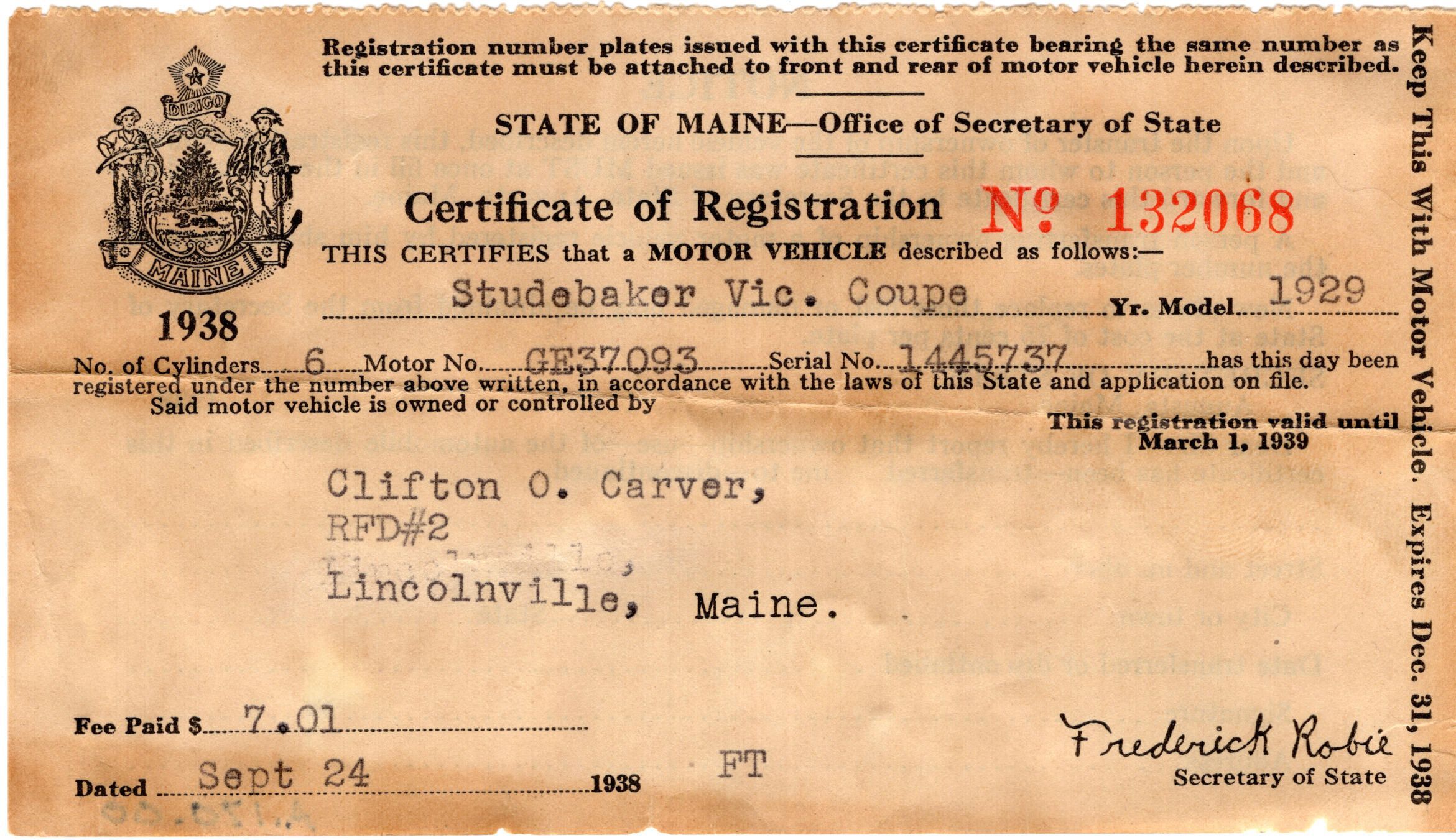 Set of Two License Plates "Maine 1938" never used plus Certificate of Registration for a 1929 Studebaker Vic Coupe to Clifton Carver of Lincolnville. Brother of Emma Nickerson, son of Dennis & Sofia Carver. Donated by Viola MacDonaldRelationships