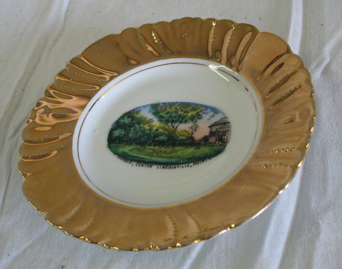 china souvenir plate, gilt border, "A souvenir, Center Lincolnvillus.e, Maine" 5.5" diameter