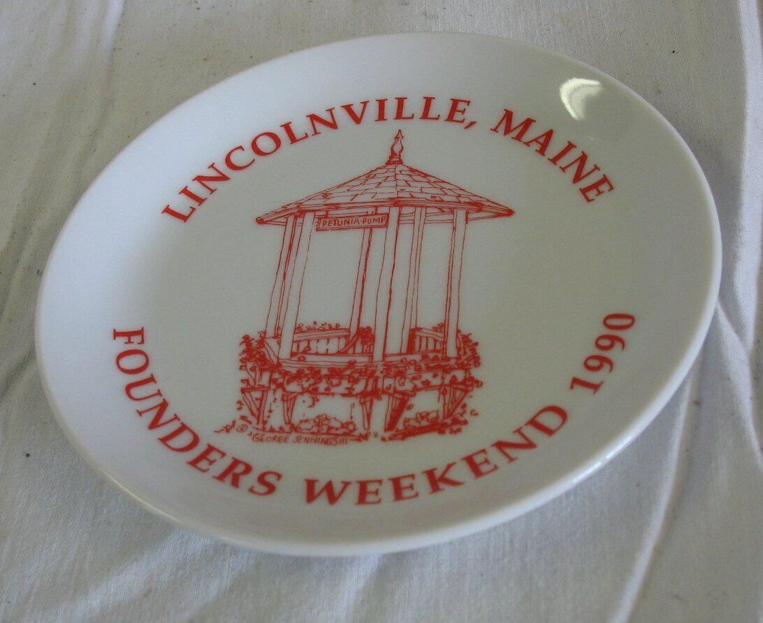 white china plate, "Lincolnvillus.e, Maine Founders Week-end, 1990" drawing of Petunia Pump, 5" diameter