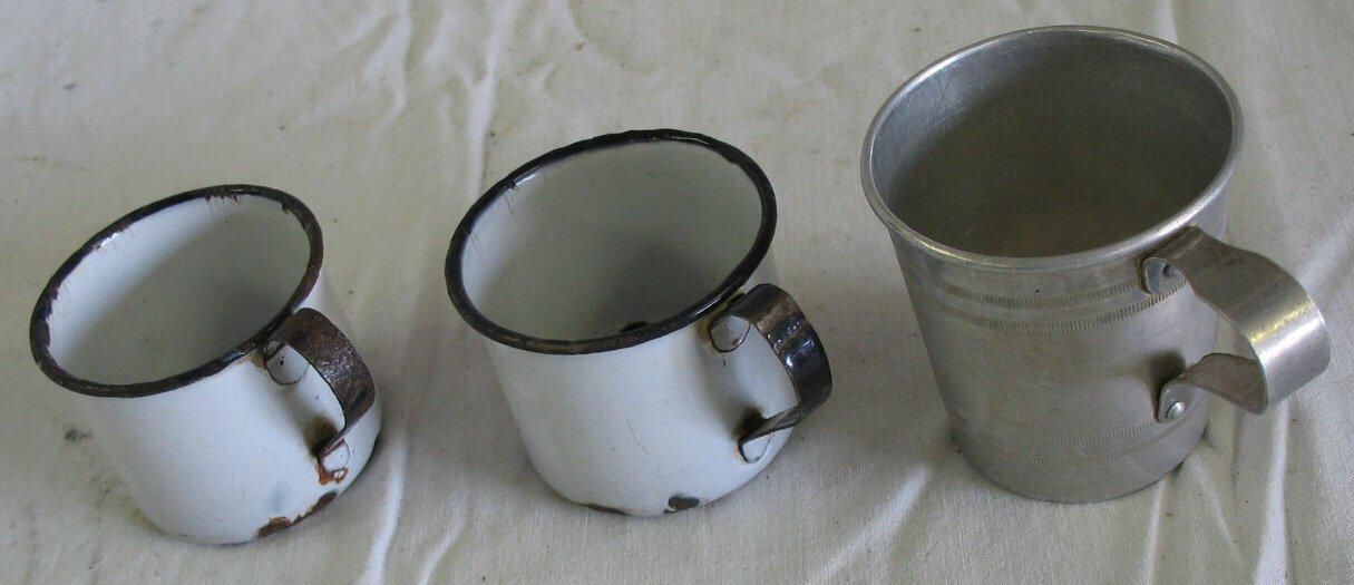 three cups one tin cup given by Ruth Pottle two white enamel cups all probably used by a child at school
