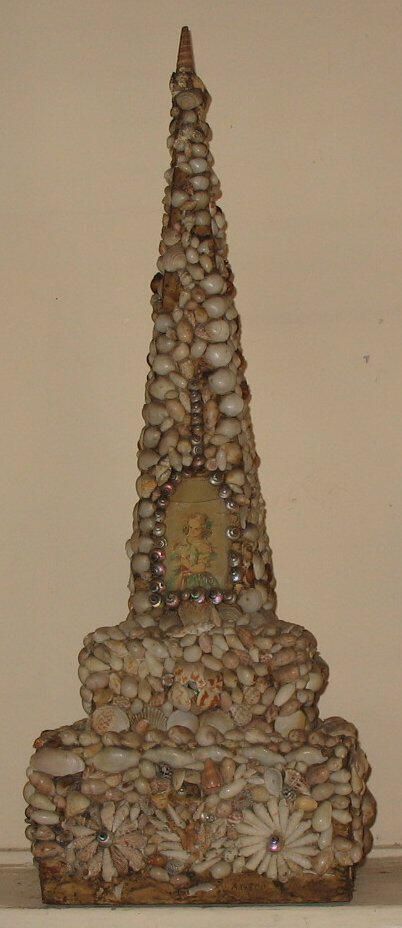 seashell tower, 27" high by 9" square base, shells glued to a wooden form