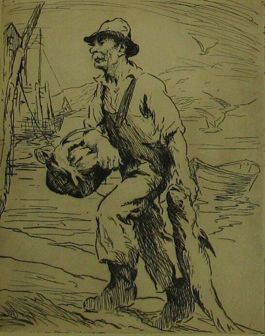 etching of fisherman coming ashore with a basket of fish in one hand and dragging a large fish in another unmounted image, 8 1/2 x 10 1/2