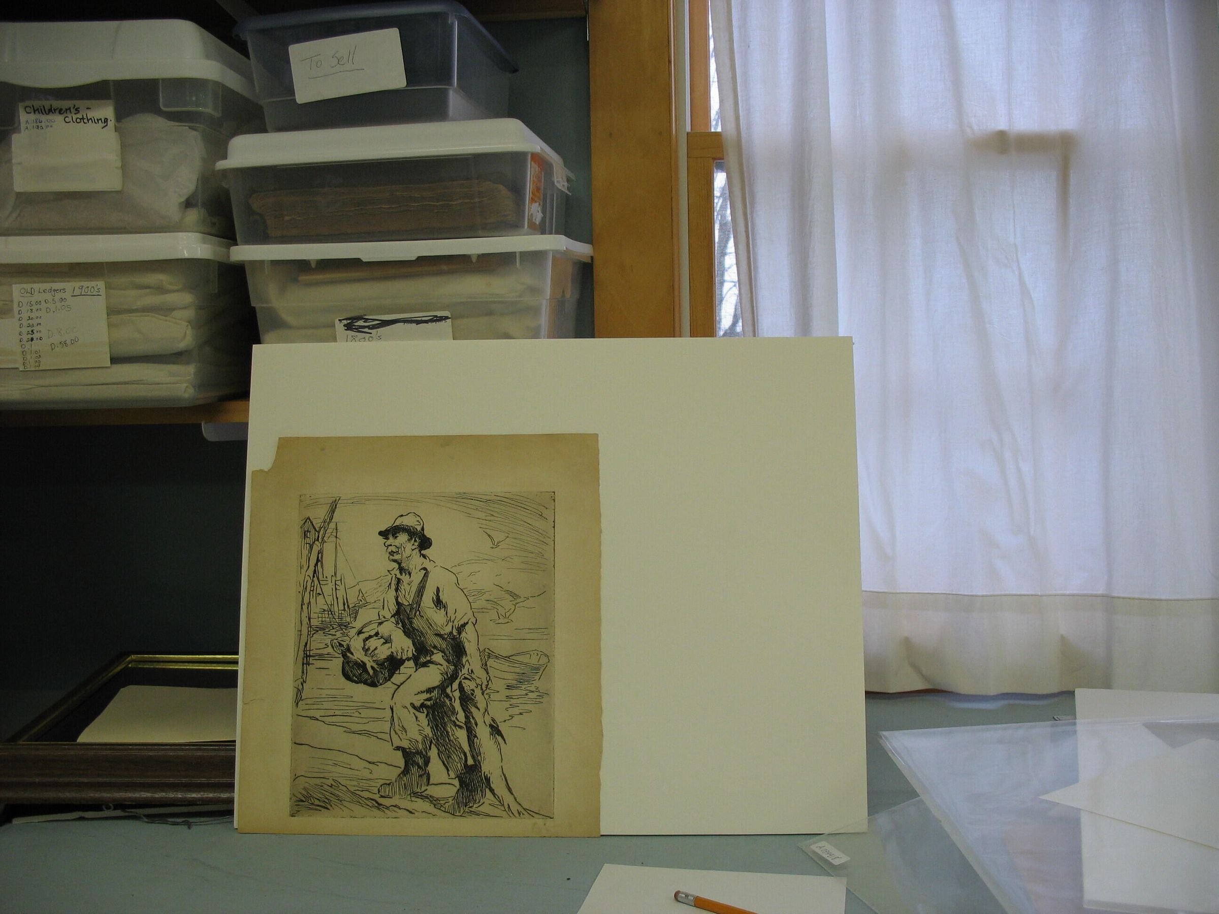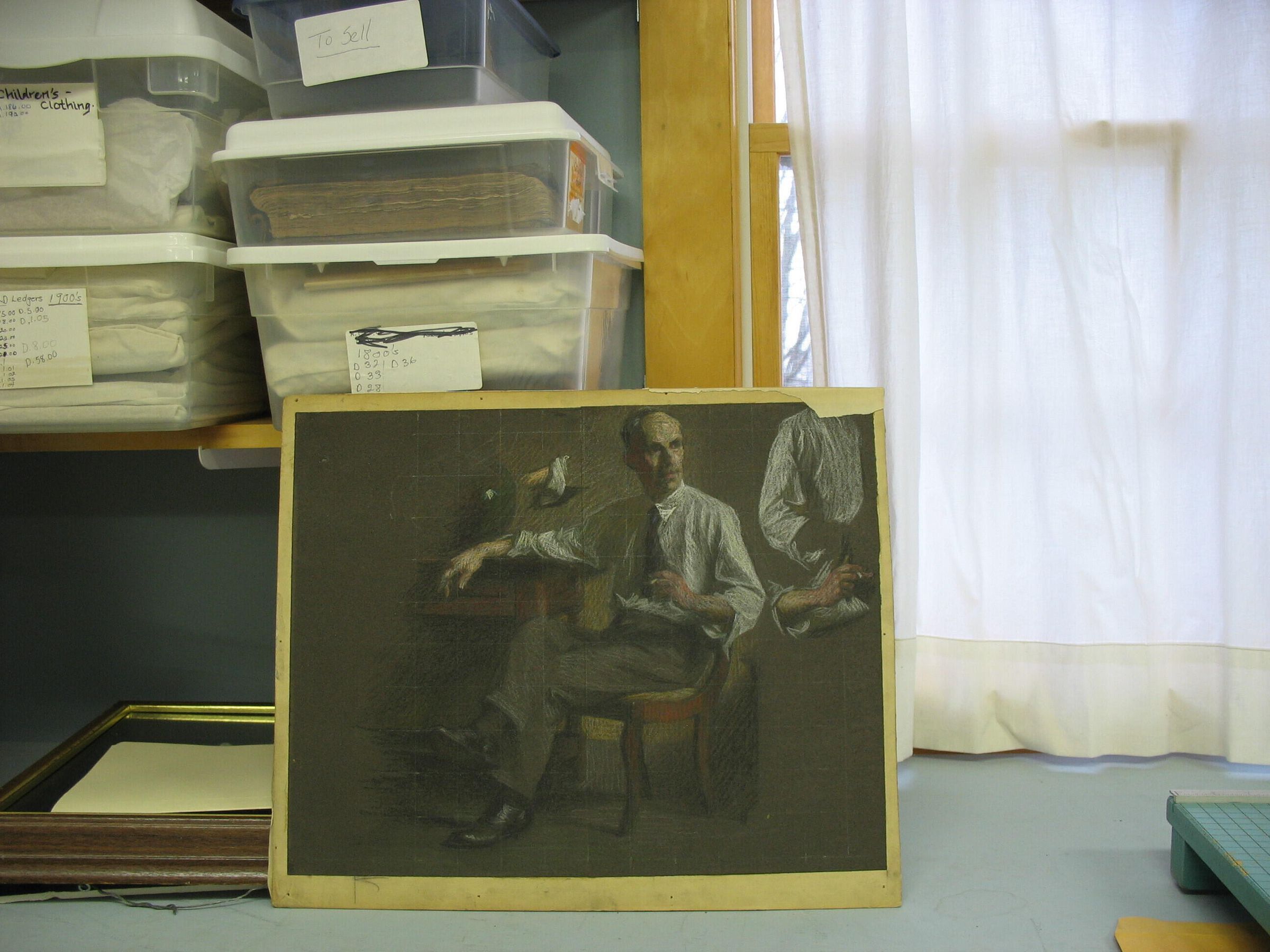 pencil drawing of a man, smoking a pipe, sitting in a chair mounted, unframed, 11 x 18 1/2