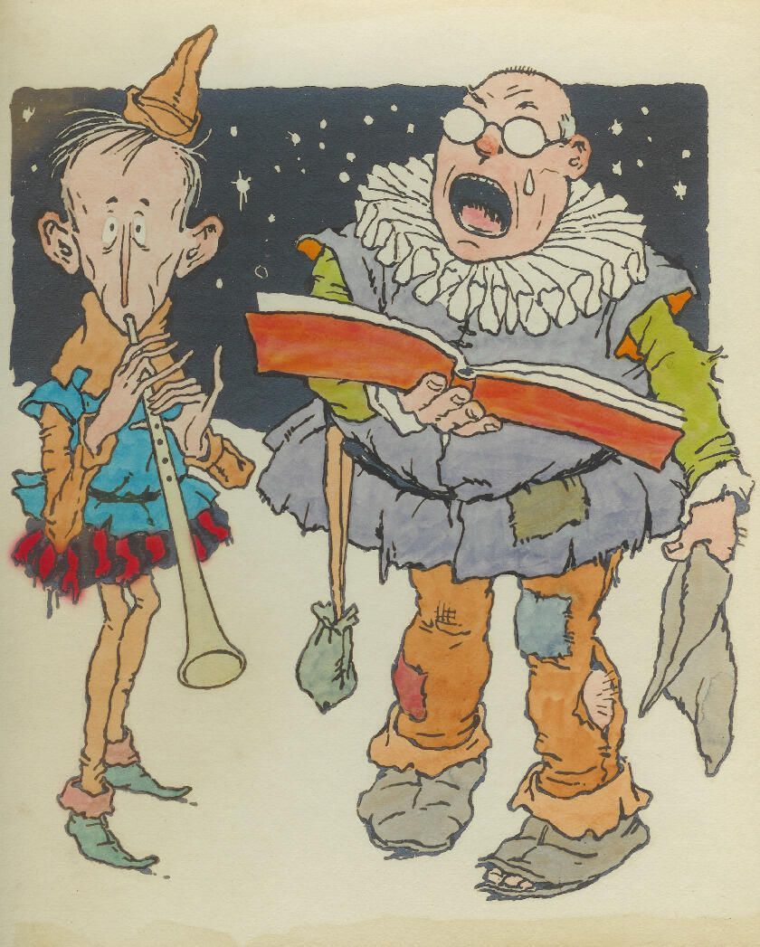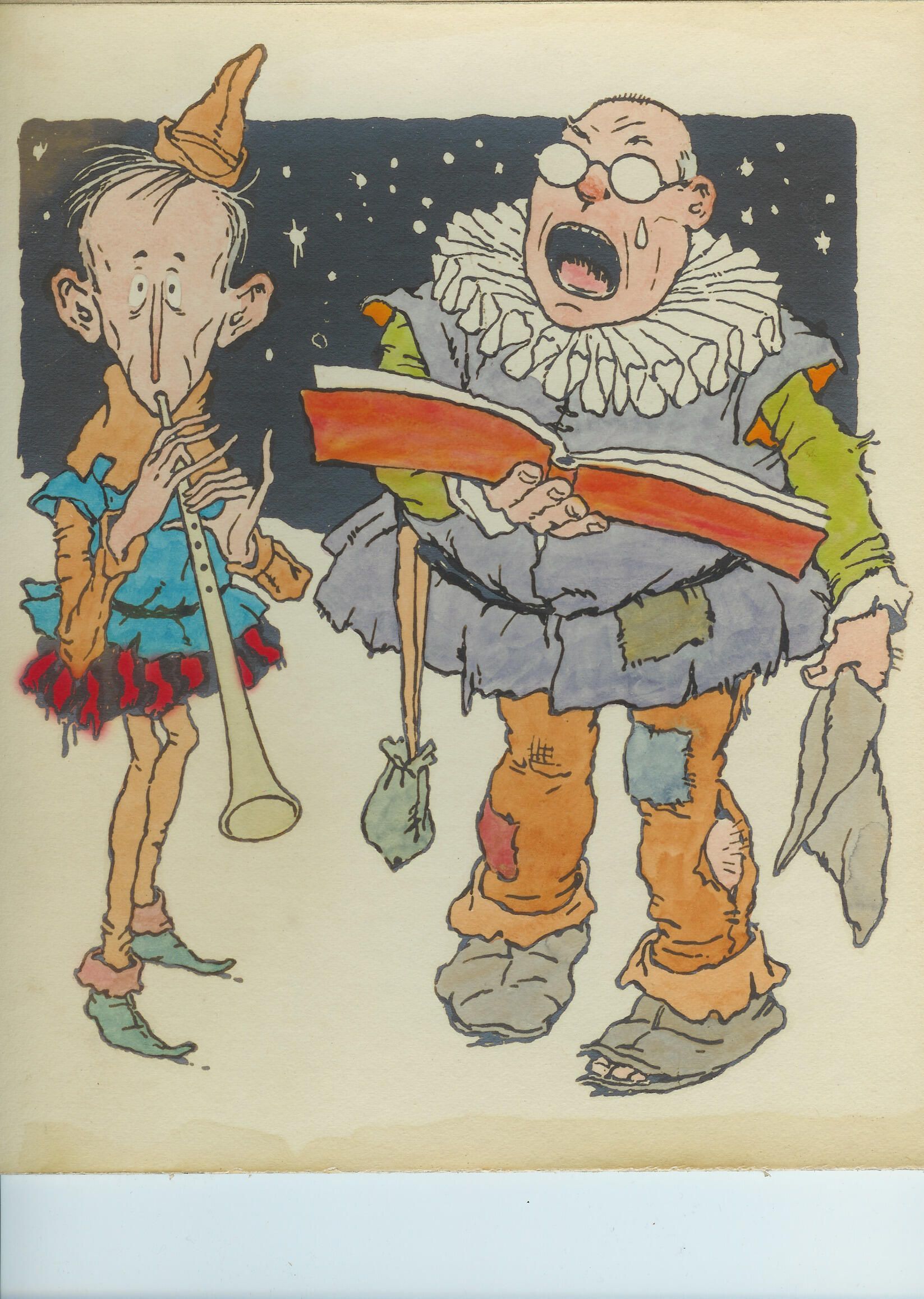 original artwork for Christmas card two characters caroling and playing horn\ 9.25 x 10.5, unmounted