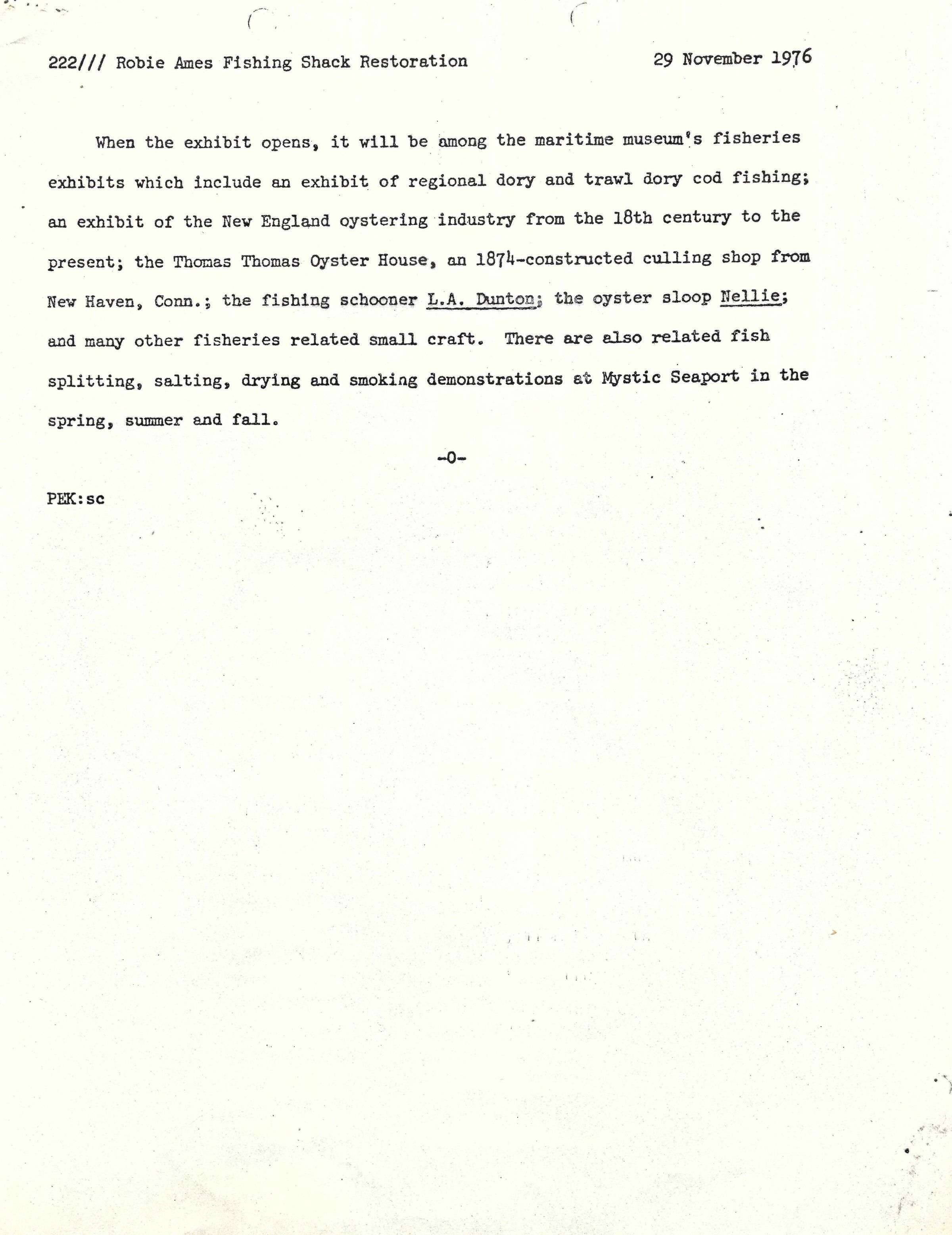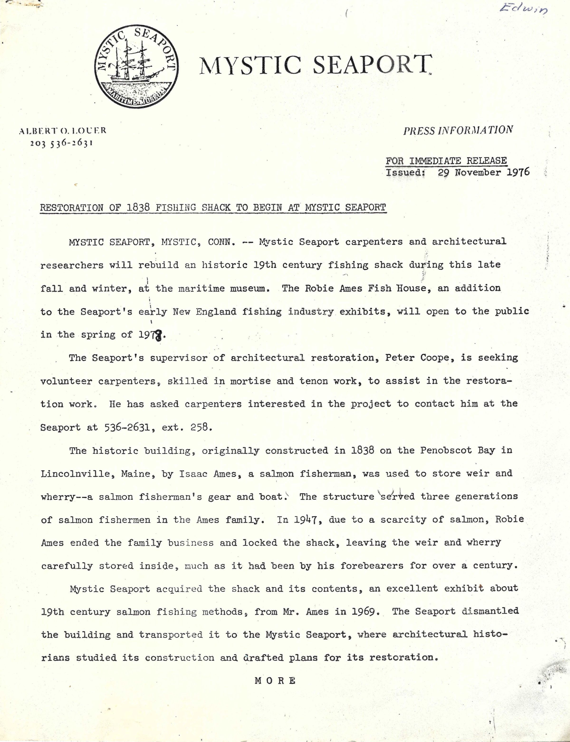 Press release reporting on the project to restore Isaac Ames' 1838 fishing shack with gear that was given to Mystic Seaport by Robie Ames in 1969Update Date