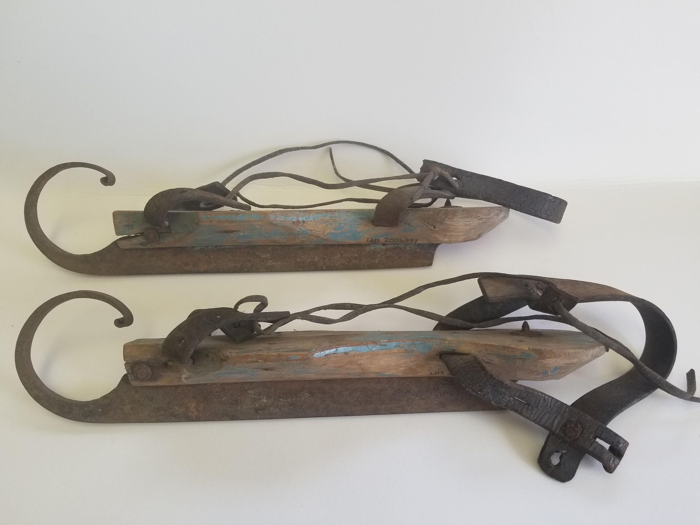 Pair of wooden skates, curved iron blades, leather straps, some blue paint remaining on shoe part; a screw on heel went into boot heel
