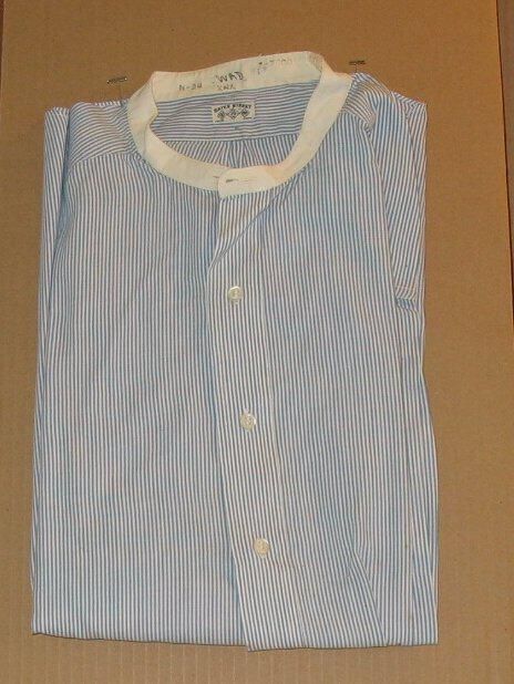 collarless cotton dress shirt, blue and white striped, starched cuffs, "Bates Street" label, laundry marked "Wade"Relationships