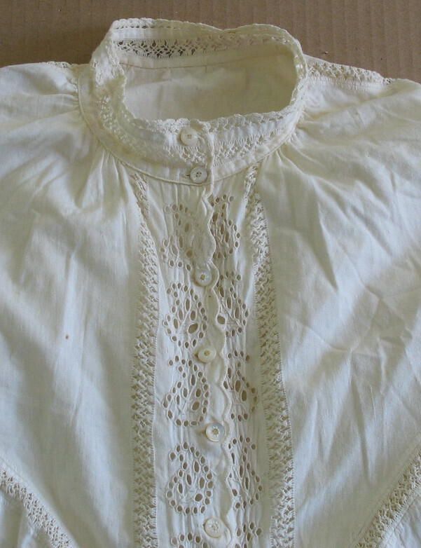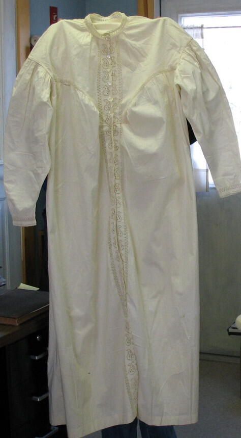 white cotton nightgown, long sleeves, opens full length, buttoned partly down front with tiny pearl buttons, high lace-trimmed neck, eyelet lace borders both fronts. Sleeves gathered at top, lace insets in yoke and along eyelet.