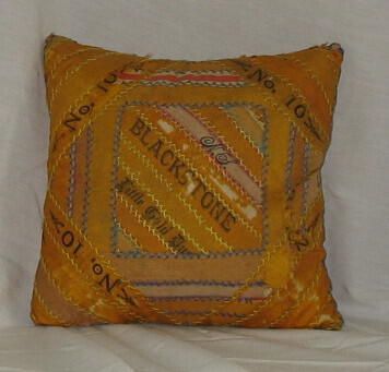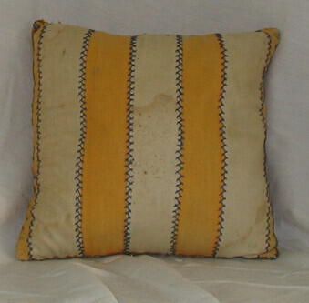 large pincushion, top made of strips of gold-colored silk sewn together with feather stitch in blue and golden/yellow thread