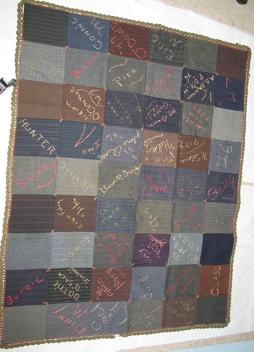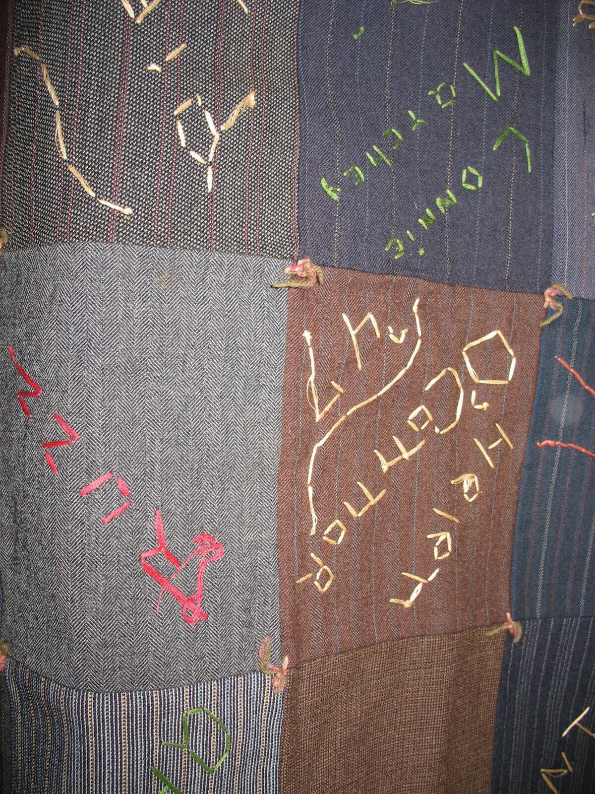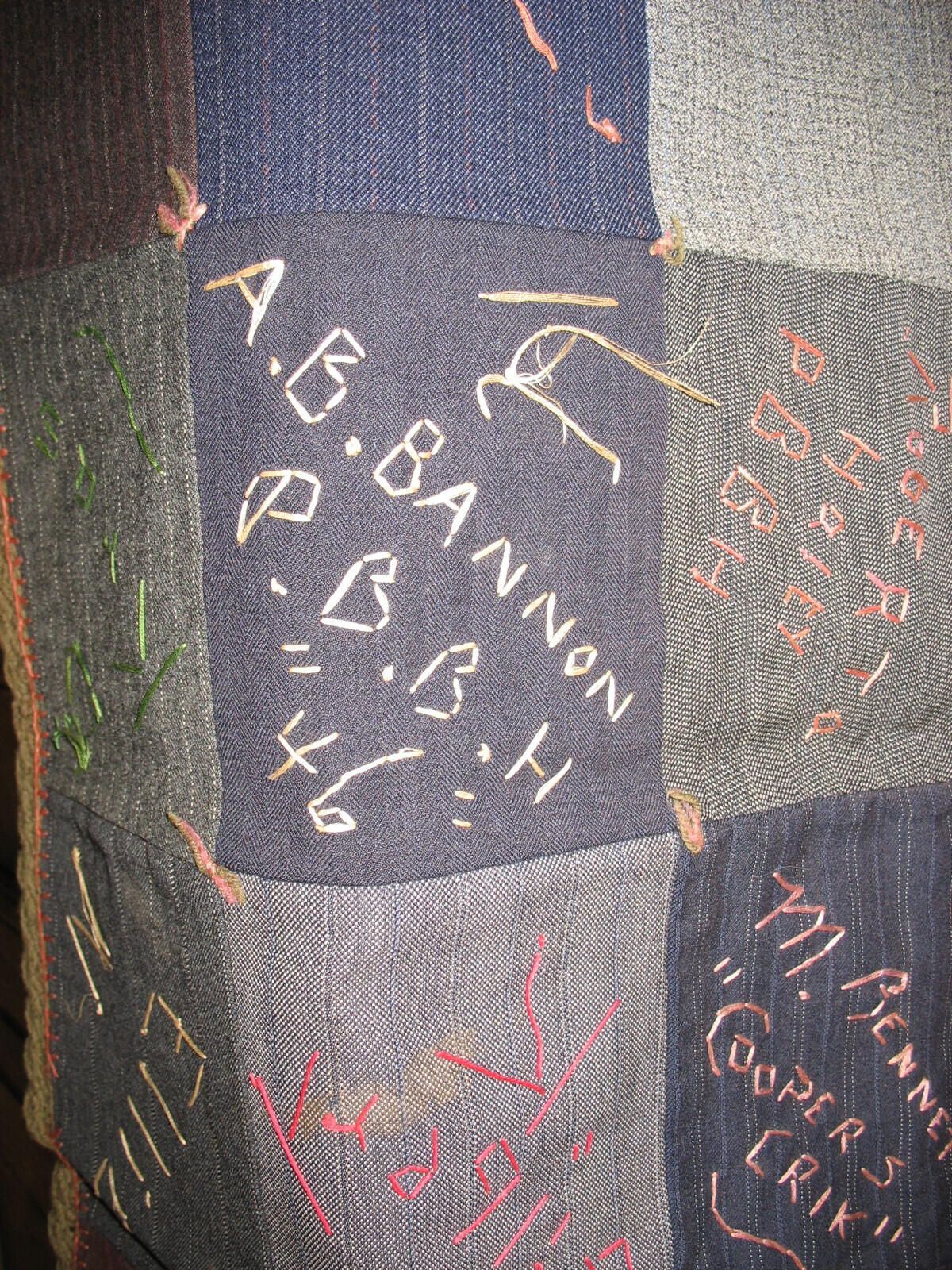 Quilt squares are put together neatly, tied in the corners with greenish wool and pinkish floss, and the edging done carefully, but the names are embroidered quite haphazardly, as if done in a hurry.