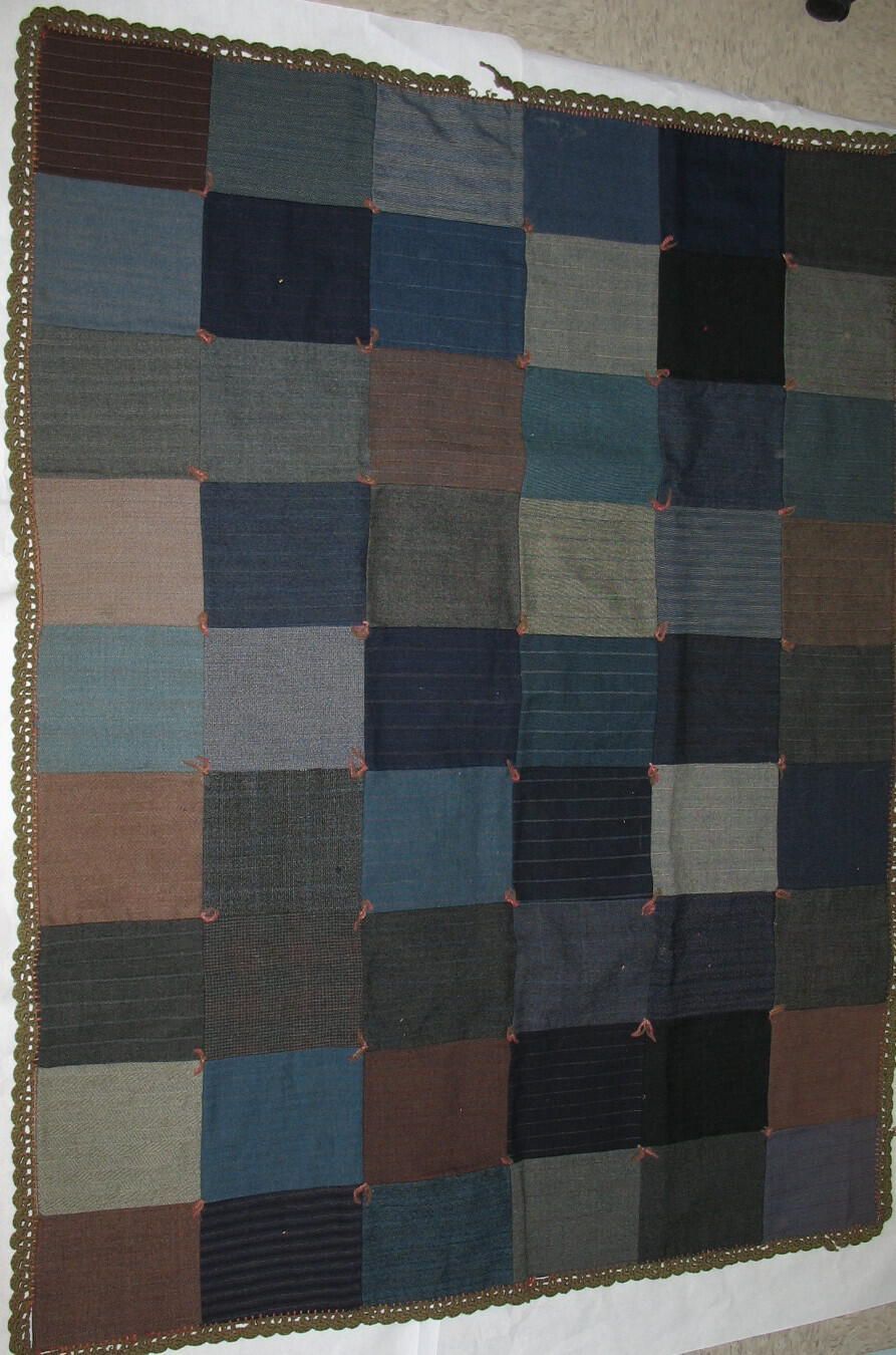 Friendship quilt made of wool squares which appear to be from men's suits; 36" x 44" excluding olive green wool crocheted edging
