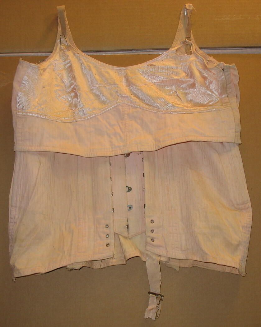 corset with built in bra; constructed with heavy elastic bands and stainless steel hooks (Pat. 1,402,642)