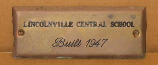 brass plaque which was on the door at the old Lincolnvillus.e Central School, the 1947 era building which was abandoned in April of 2000 due to toxic mold found all through the building