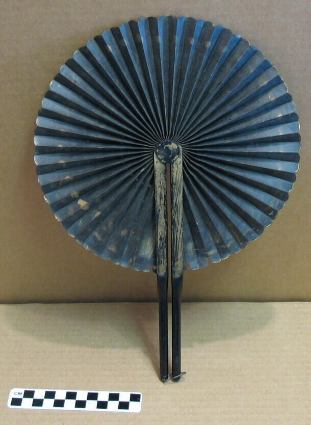 2 black lacquered sticks, hinged at top, open to a circular black paper fan, scalloped edges and traces of gold decorative paint (appears blue in photo but is actually black)