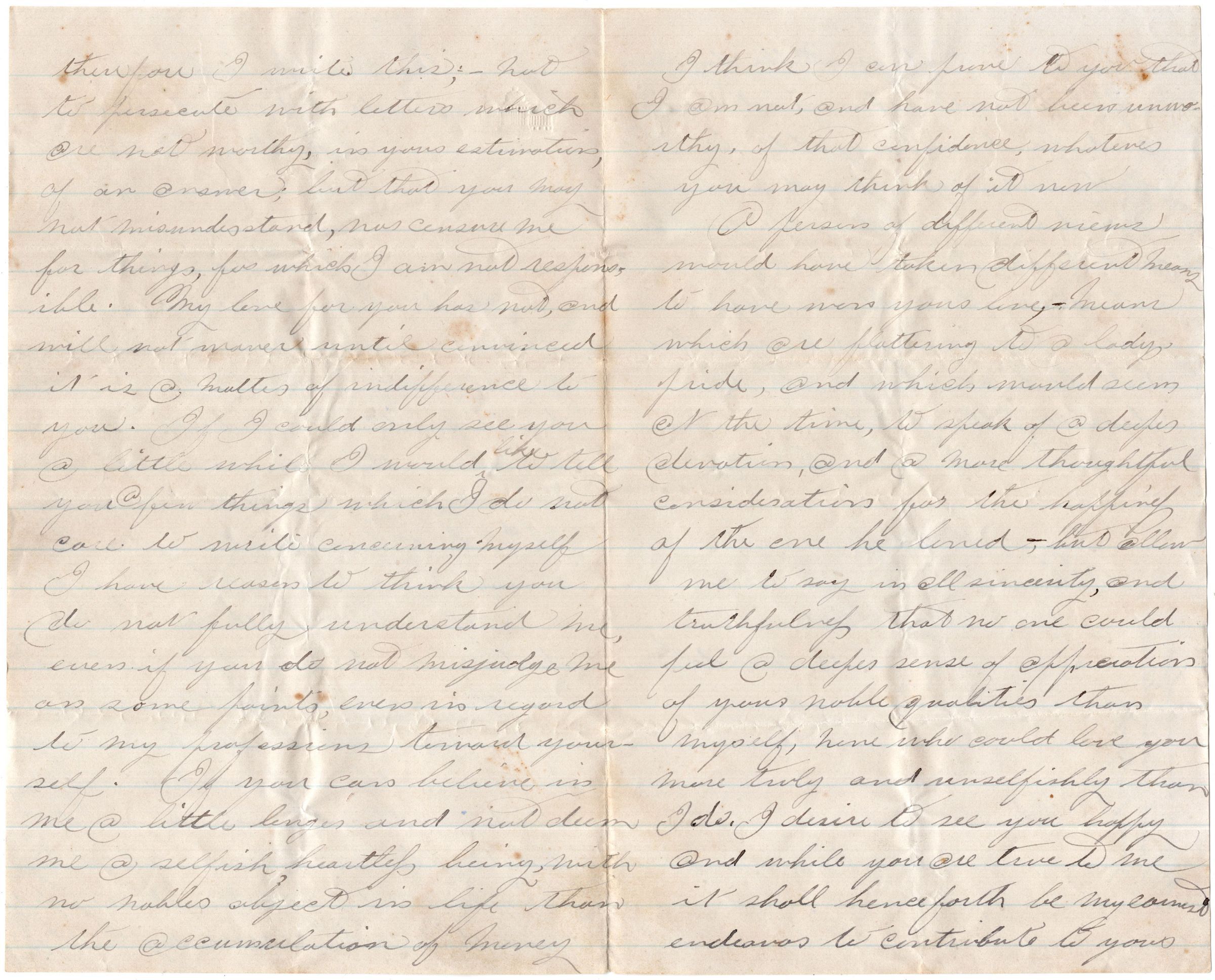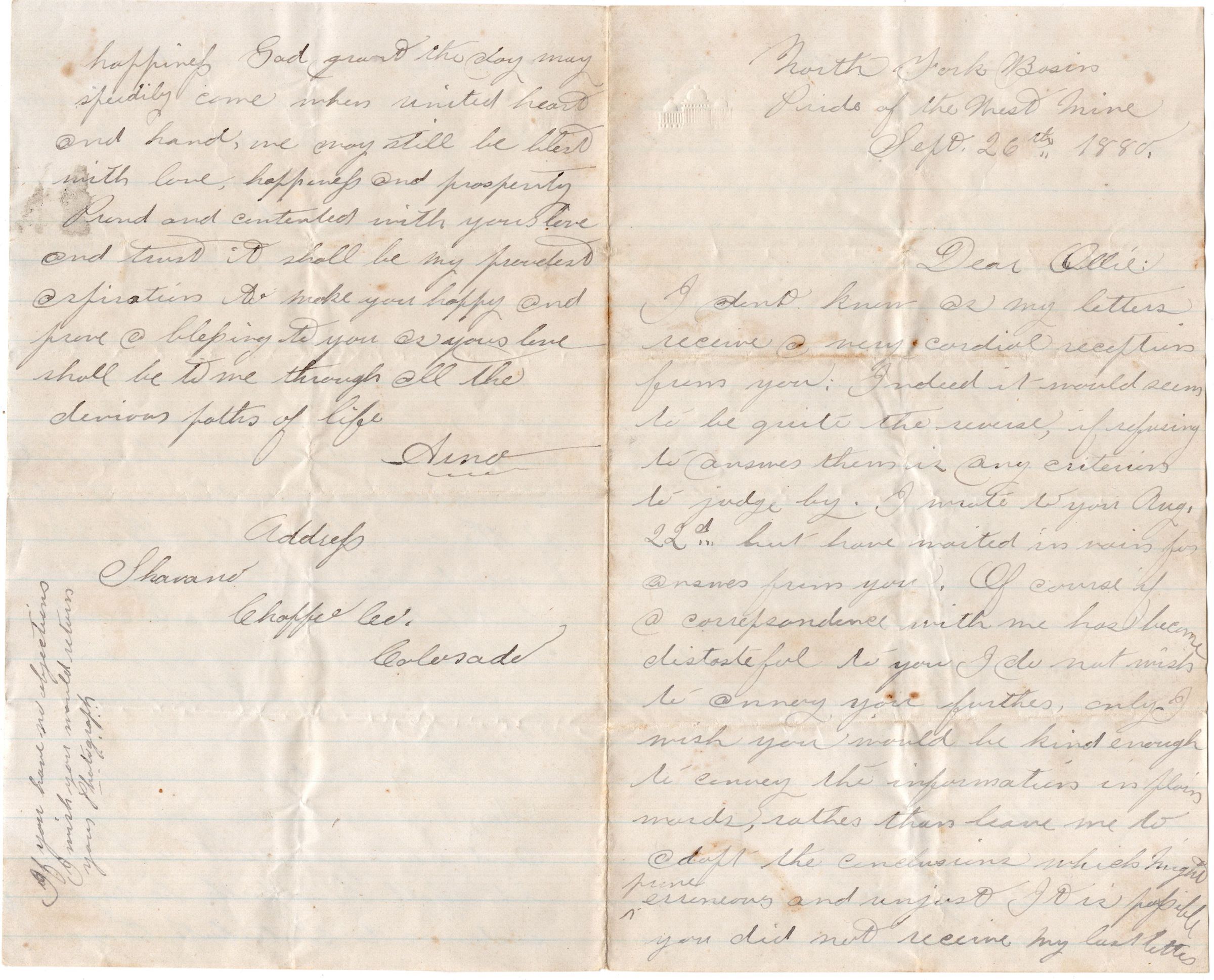Knight Collection - 1880 Letter; Dated September 26th; Written by Arno Knight to Olive Drinkwater; Arno is working in ColoradoRelationships