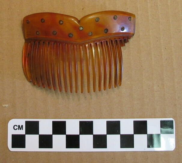 hand-carved tortoise shell comb, rhinestones embedded in top three teeth missing