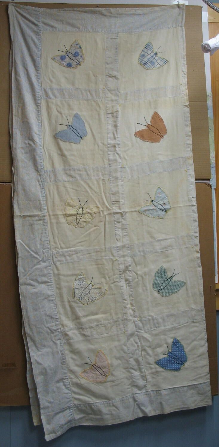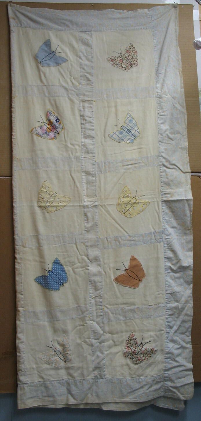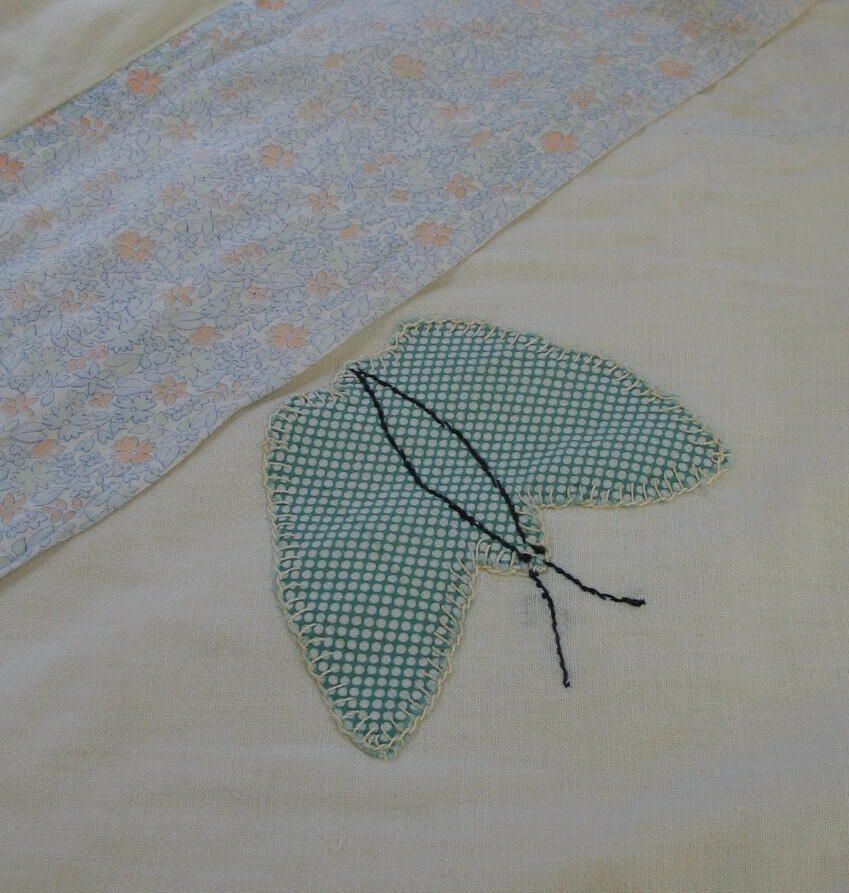 Hand appliqued butterflies using buttonhole stitch on 20 muslin squares, 1`0 x 10"