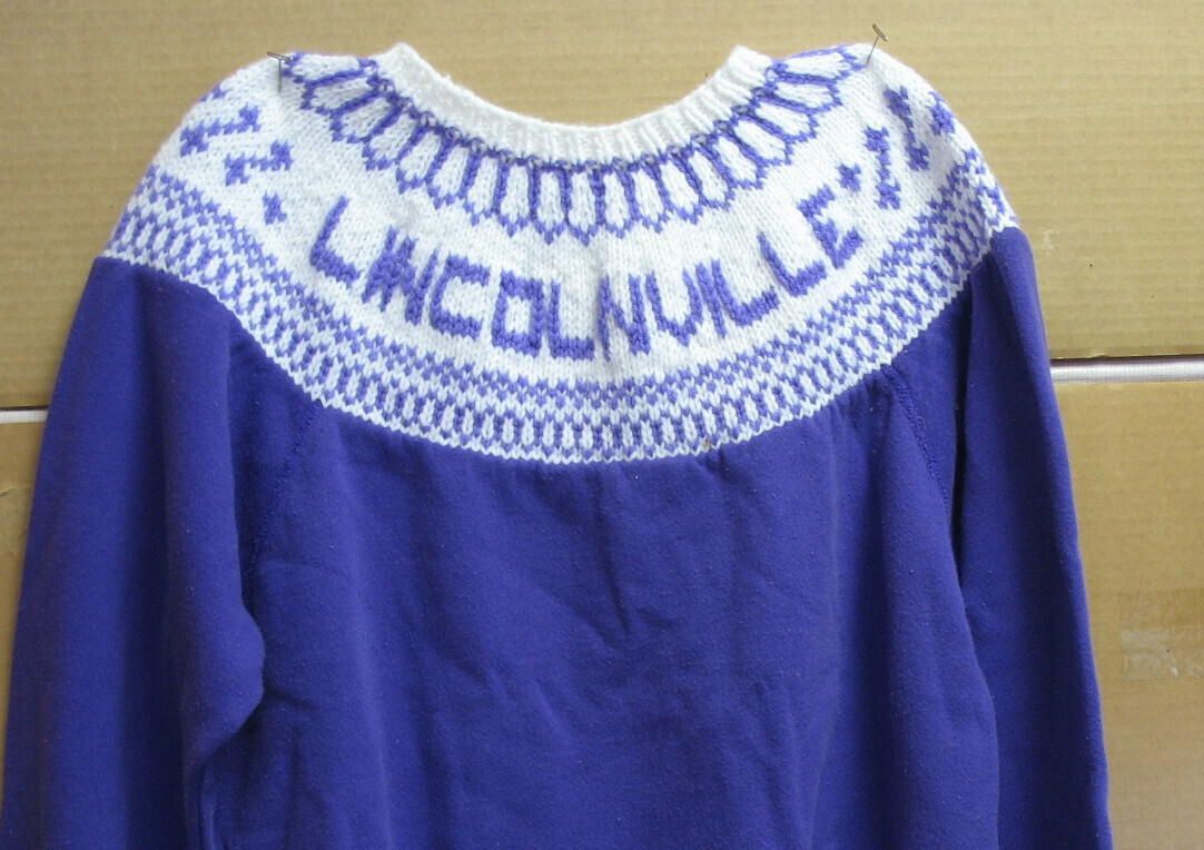 purple sweatshirt with handknit yoke which reads "Lincolnvillus.e" made as a fund-raising item