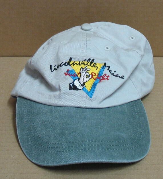 baseball cap with "Lincolnvillus.e, Maine Just Right" embroidered logo