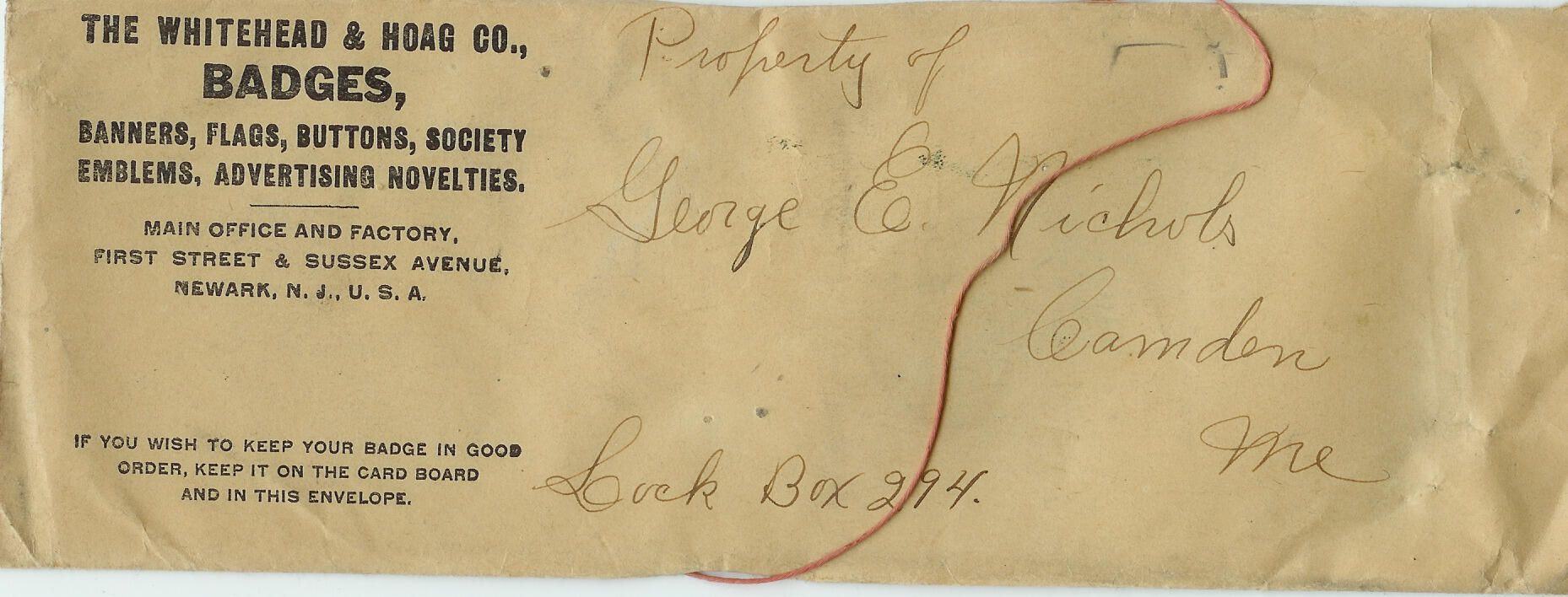 Ribbon kept in envelope closed with string, handwritten: "Property of George E. Nichols, Camden, Maine, Lock Box 294"Relationships