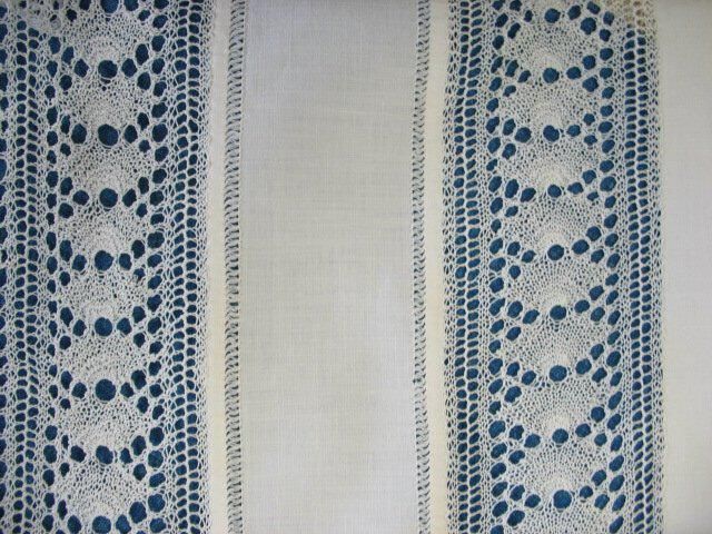 pillowcase with very fine crocheted lace edging one band inset two bands of hemstitching inset a small mended place indicates the case was used