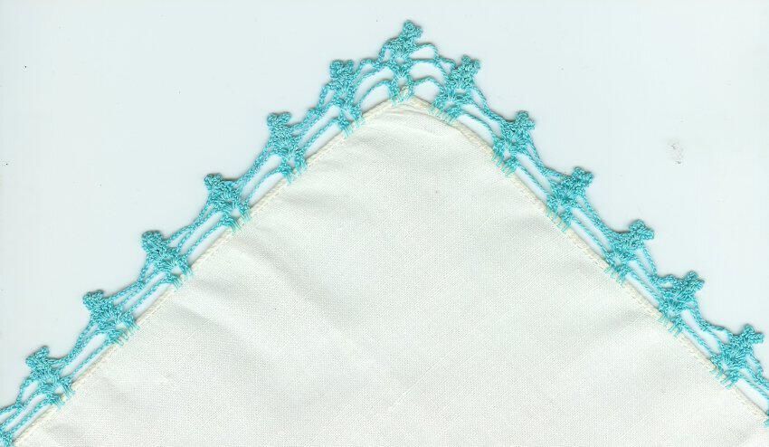 white cotton handkerchief with hand crocheted turquoise lace edgeRelationships