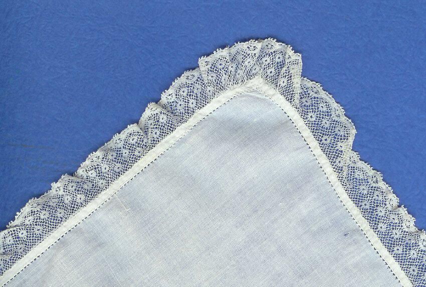 white cotton handkerchief with commercial cotton lace sewn on probably home-decorated