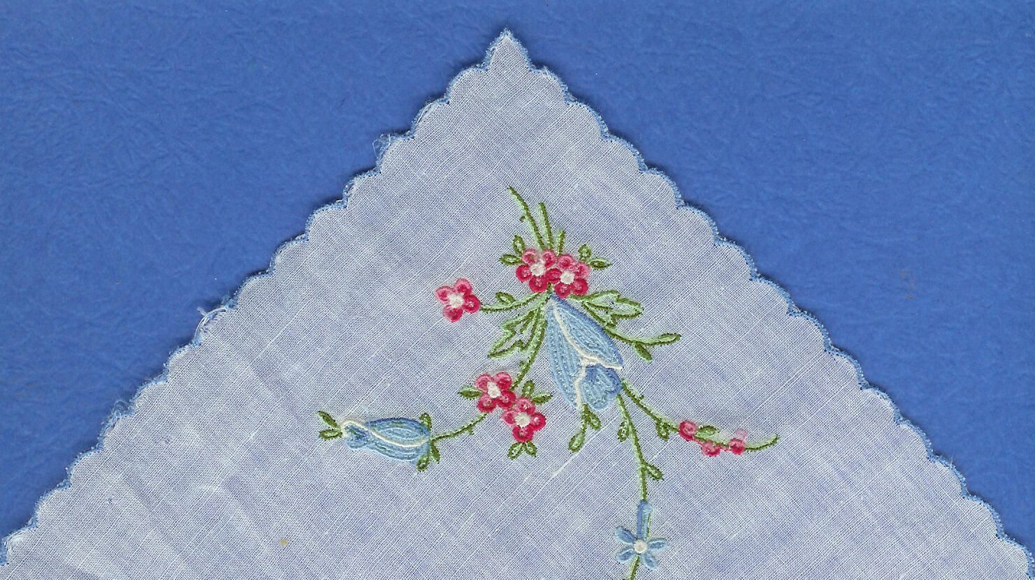 white cotton handkerchief with embroidery blue scalloped edge and bouquet of flowers in one corner probably imported, maybe machine made