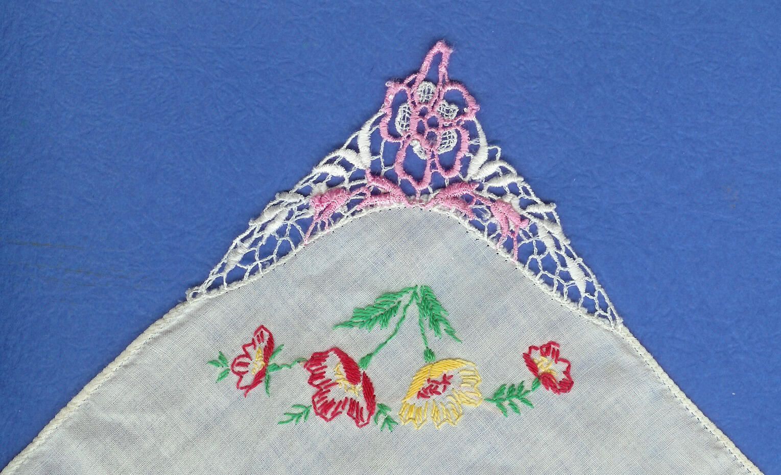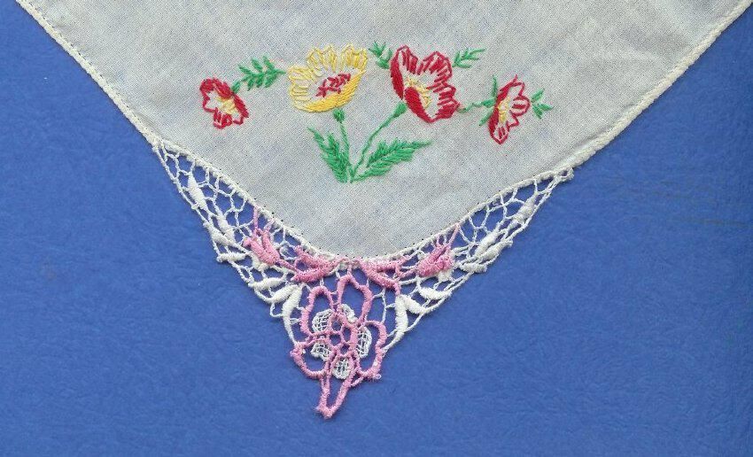 white cotton handkerchief with probably home-embroidered floral motif in red and yellow pink and white crocheted corner
