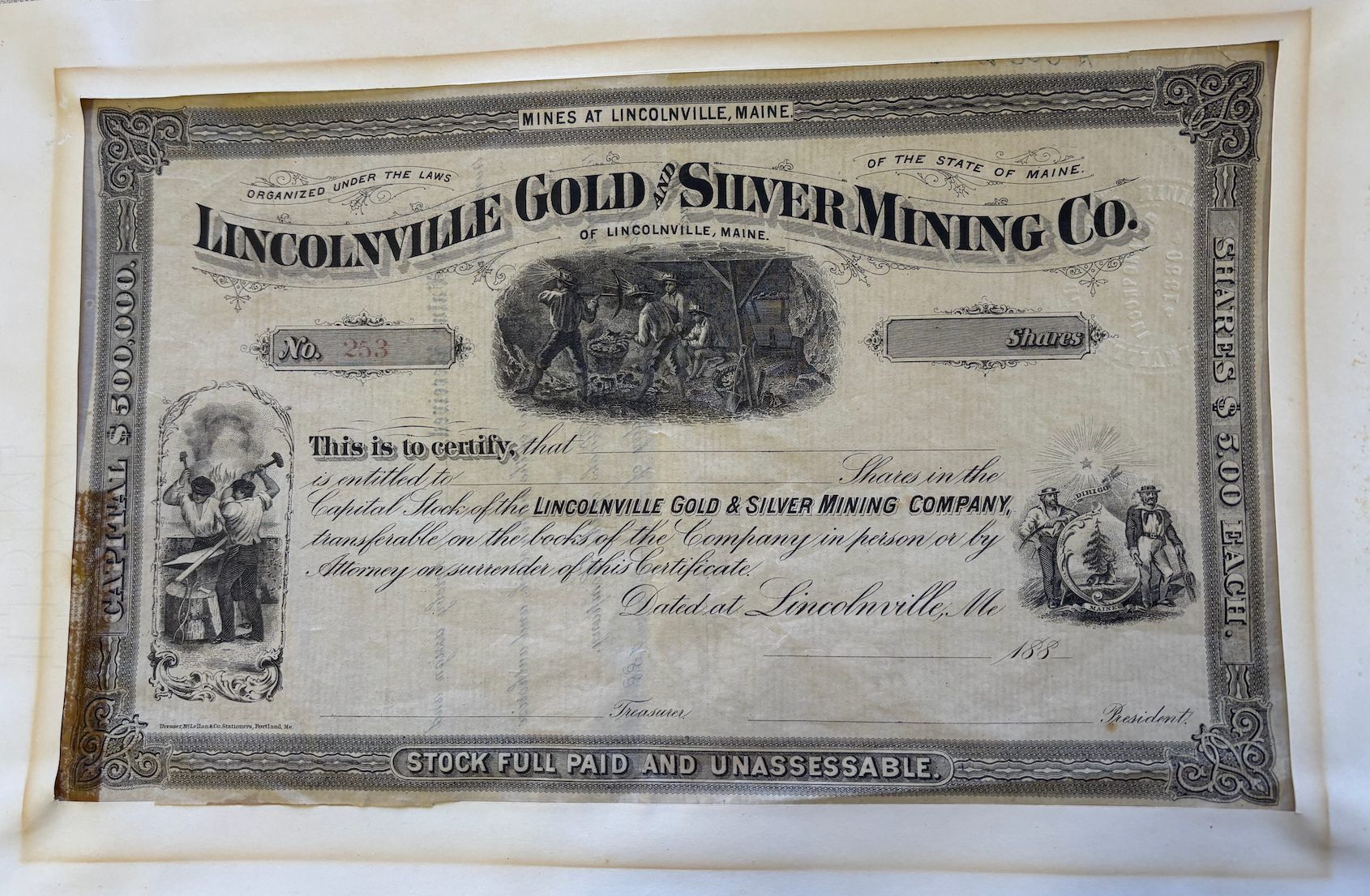 Lincolnville Gold and Silver Mining Co. Stock Certificate #253