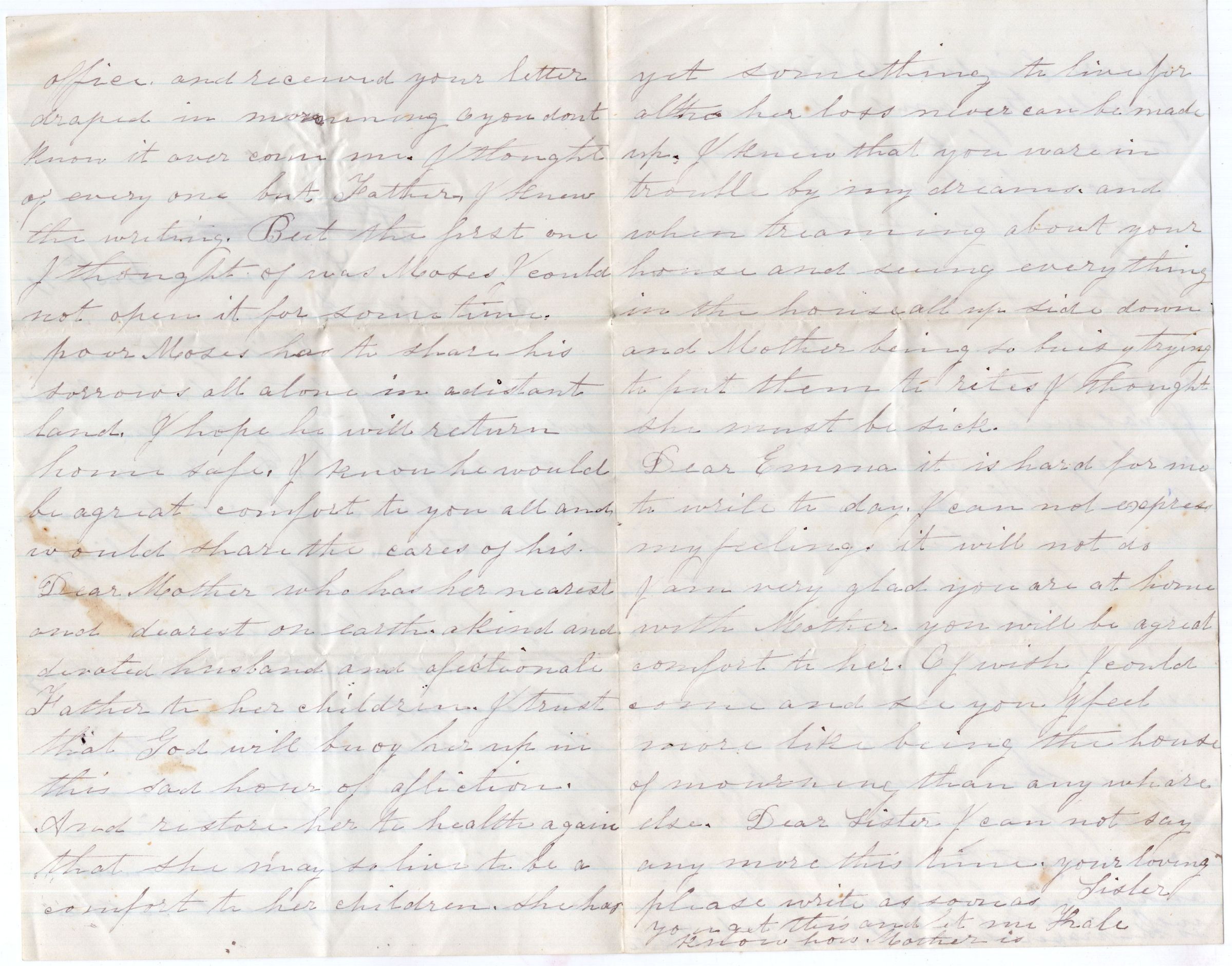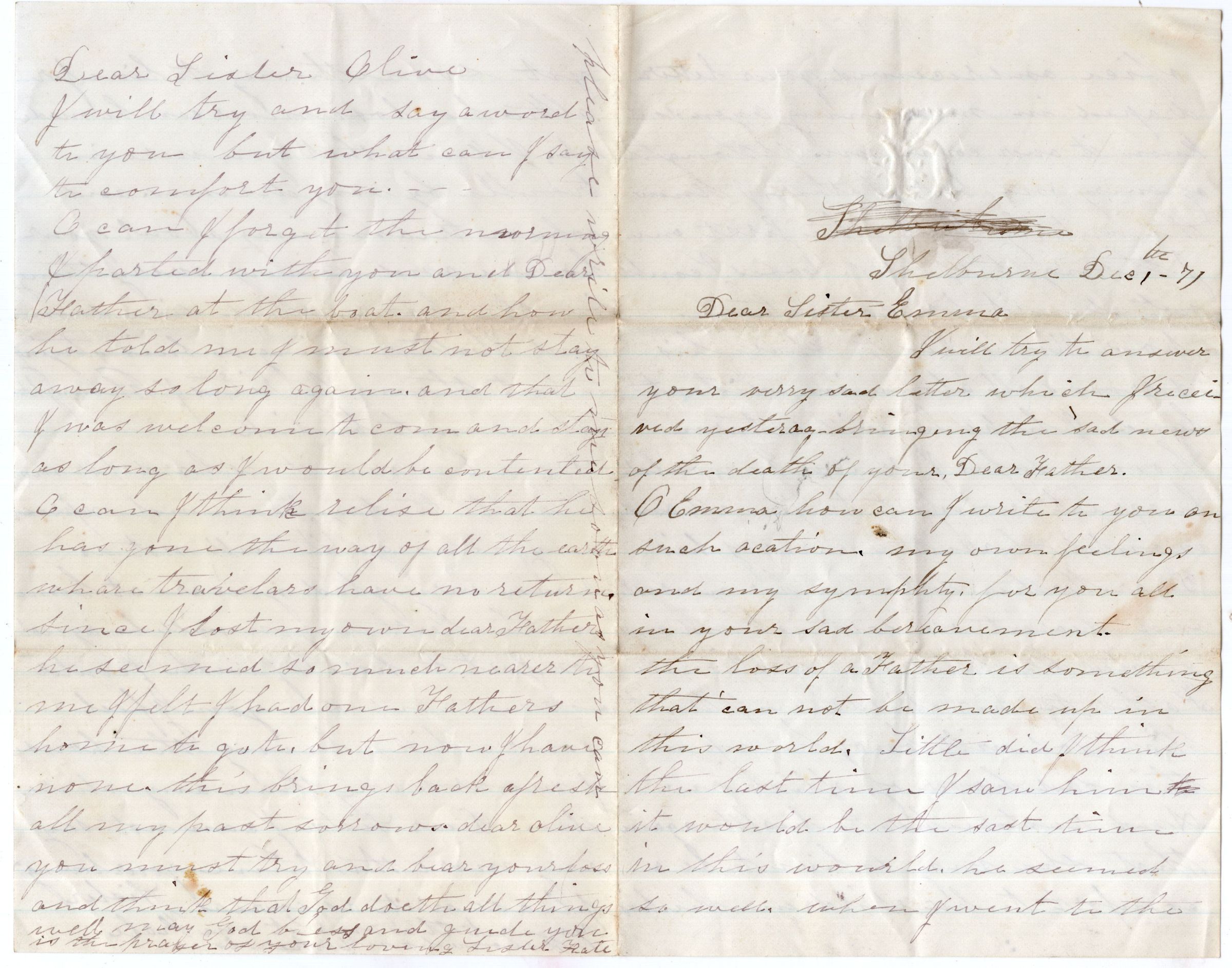 Knight Collection - 1871 Letter; Dated December 1st; Written by Kate Drinkwater to Olive Drinkwater (Knight) and Emma Drinkwater (Dyer); Kate is possibly the widow of their late brother Roscoe who died in 1867; the letter is in sympathy for losing their father, Robert Drinkwater