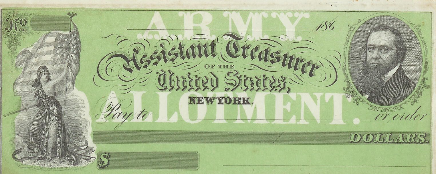 paper original Army Allotment, blank, form from the Assisitant Treasurer of the United States for Civil War soldiers