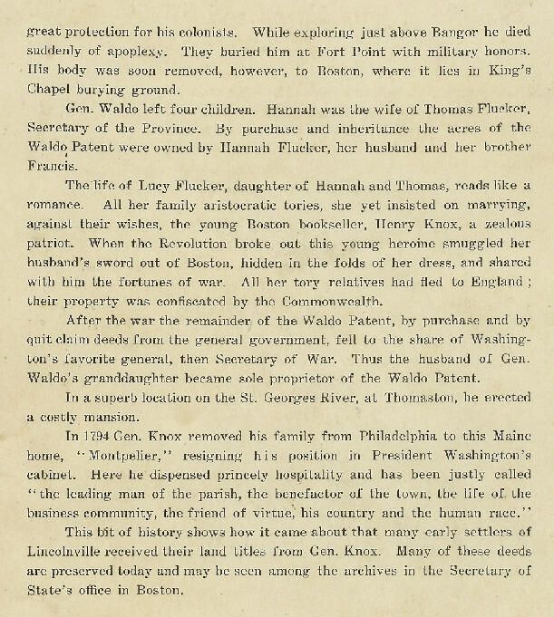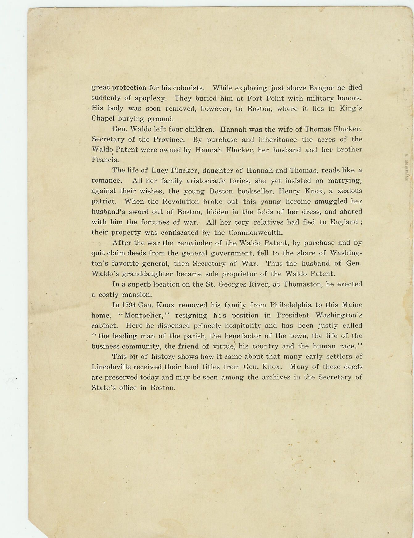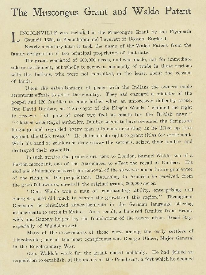 Printed description of Lincolnville History "The Muscongus Grant and Waldo Patent".