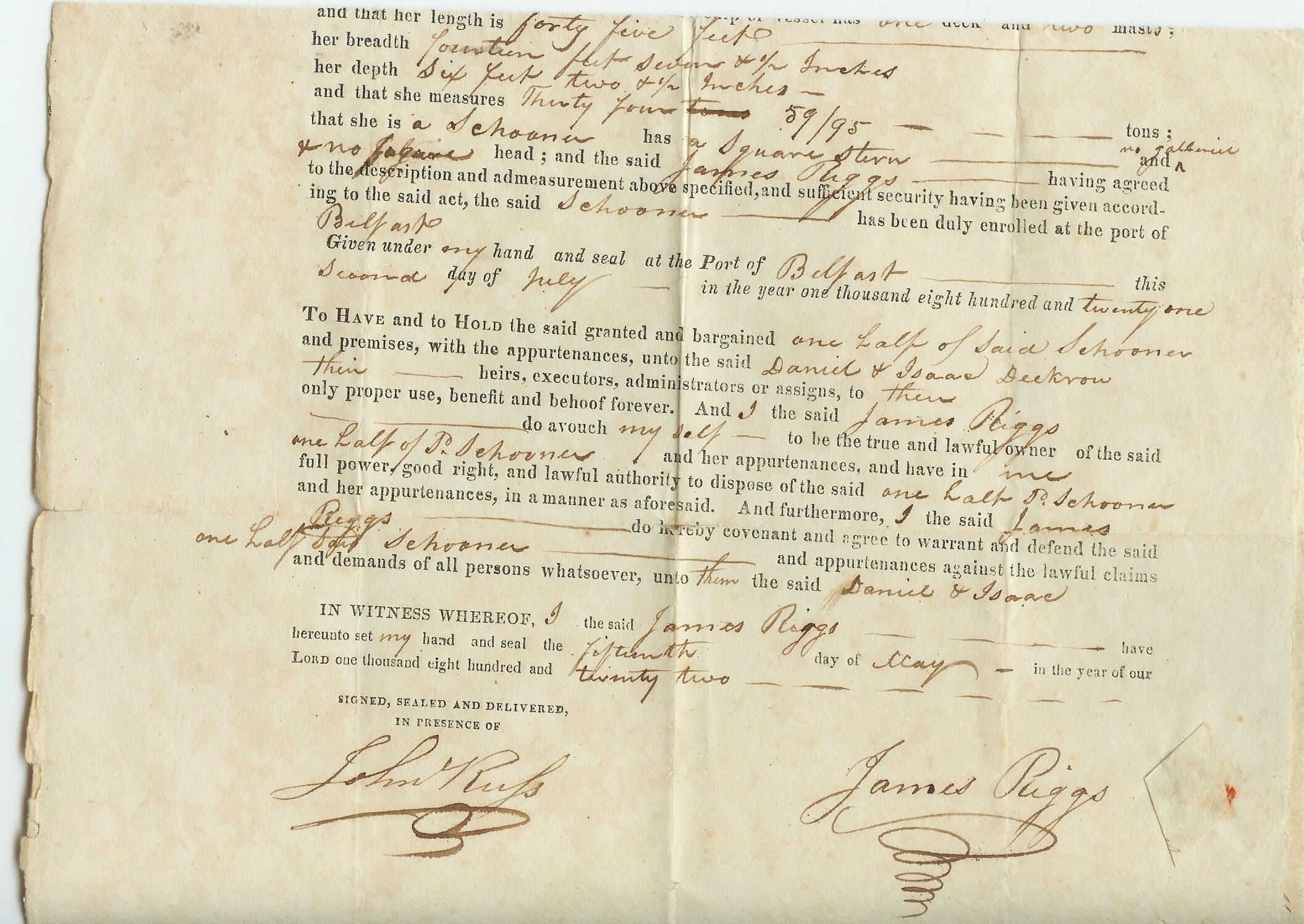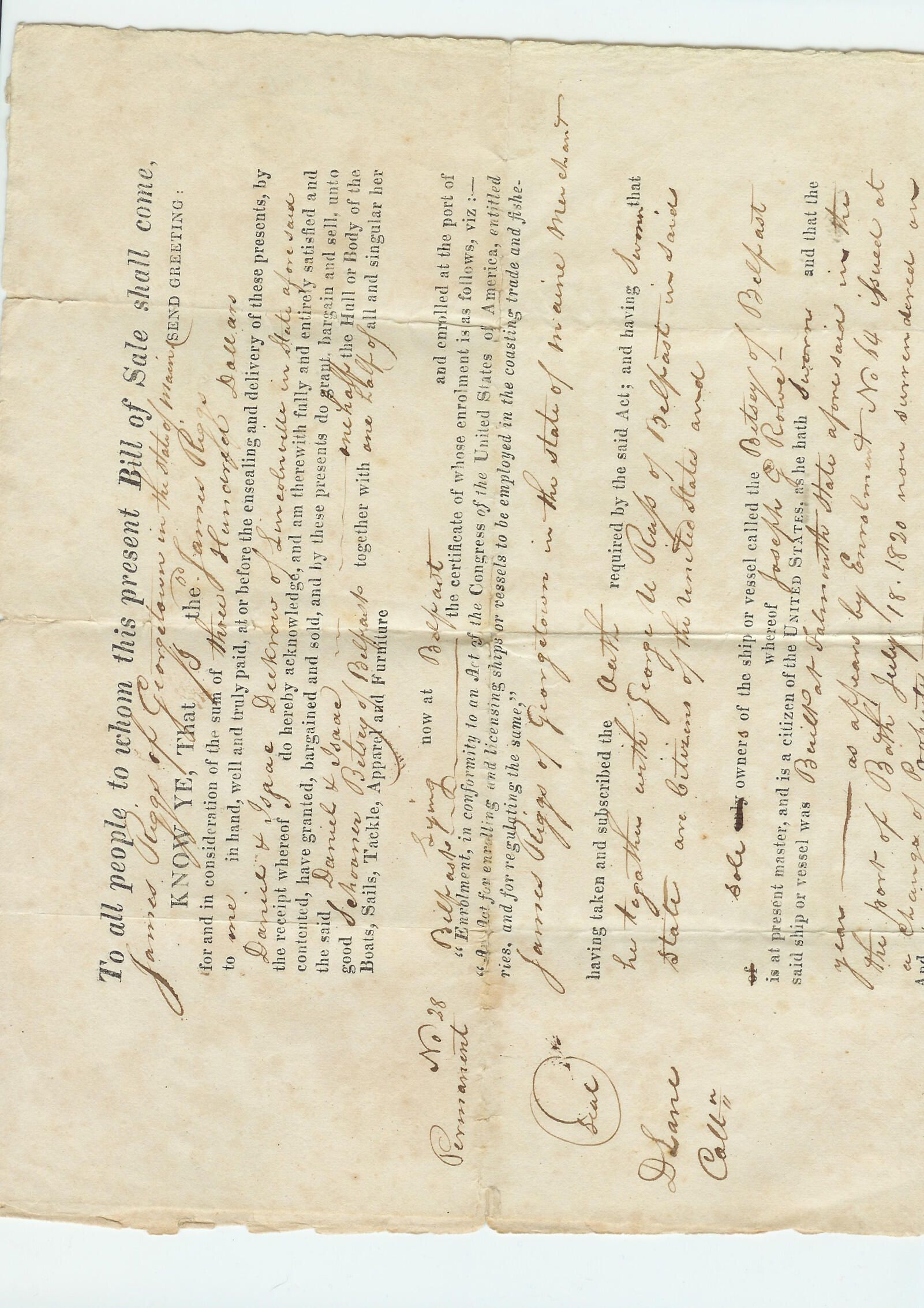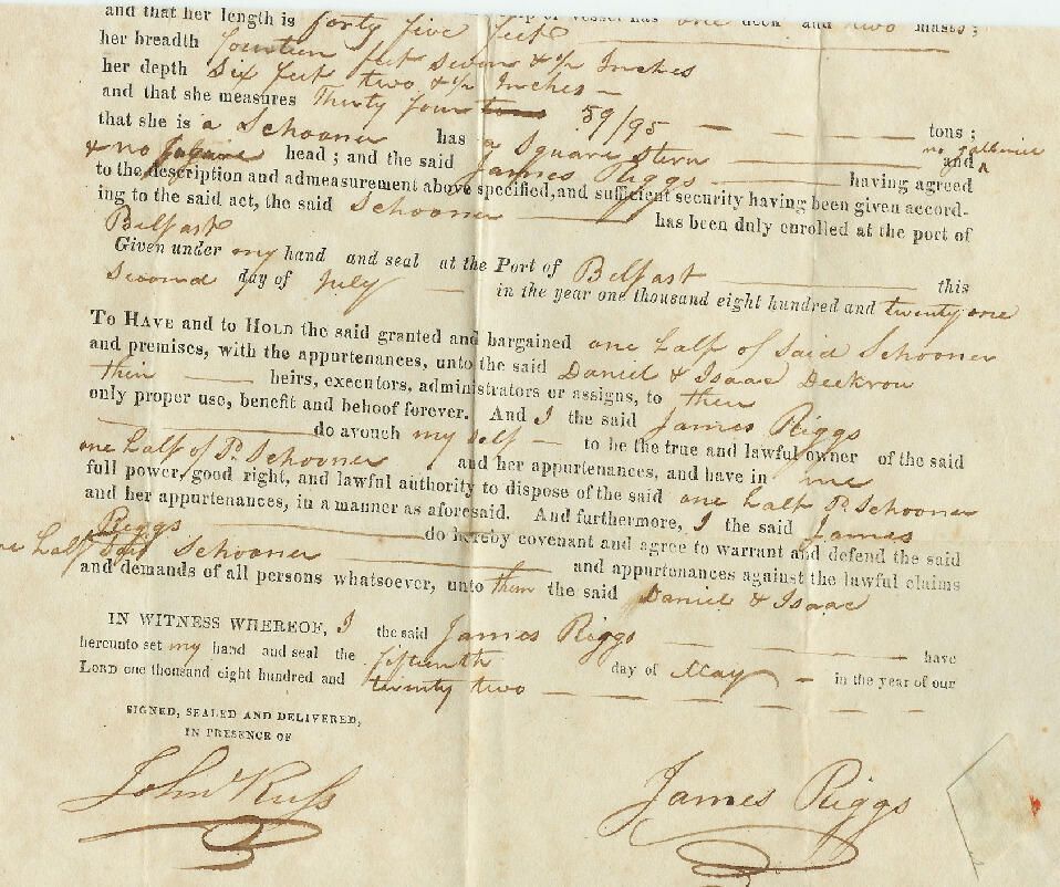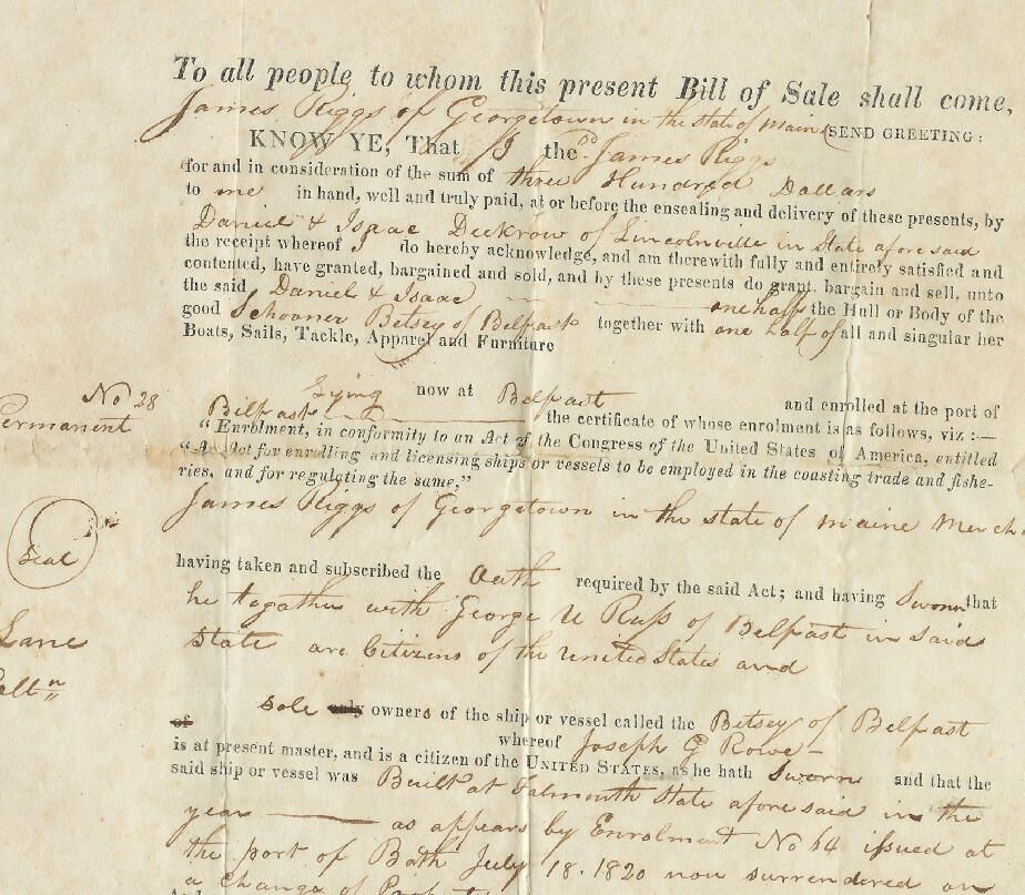 Schooner "Betsey" Bill of sale for half ownership in schooner.