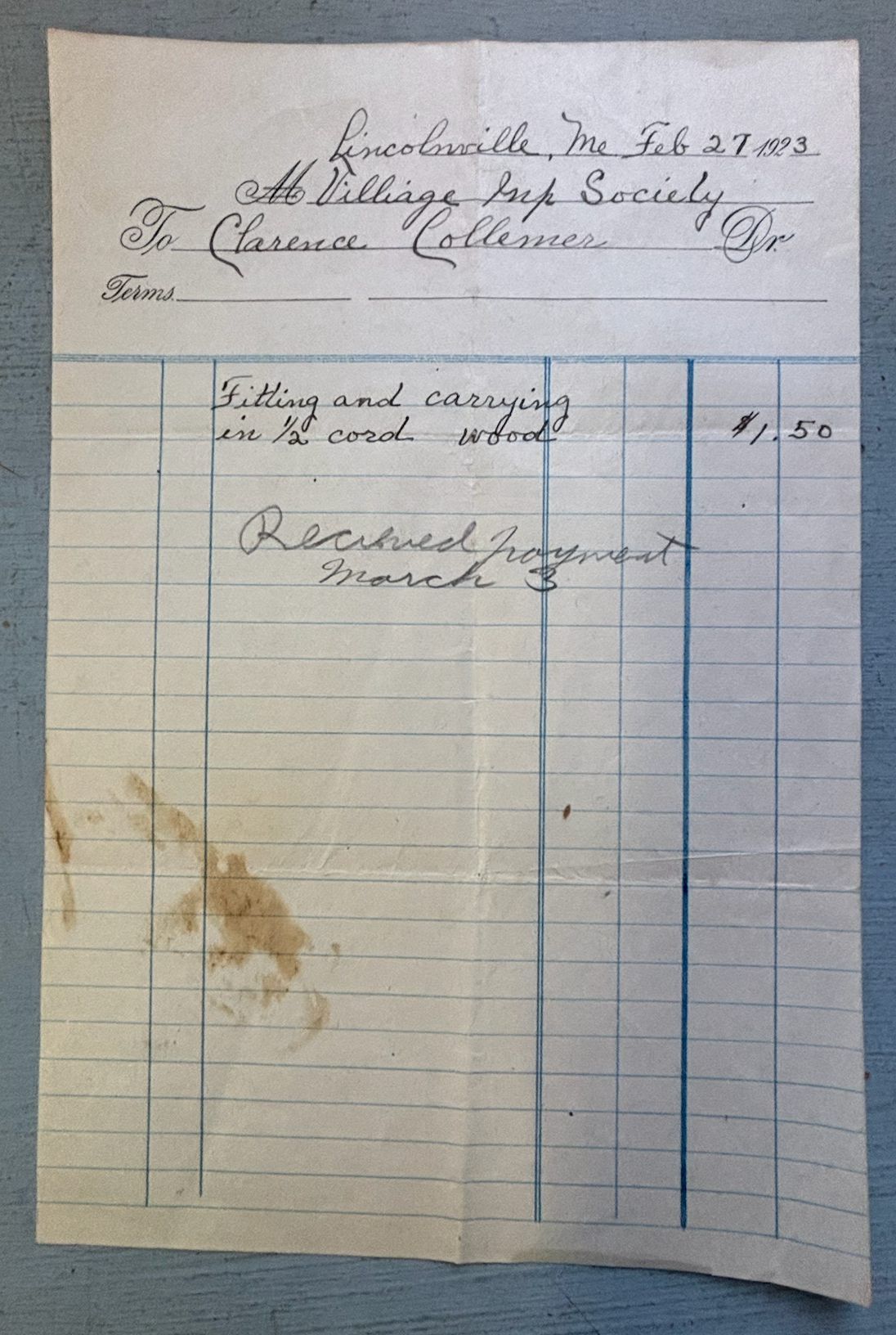 Bill of sale for one-half cord of firewood from Clarence Collemer to the Village Improvement Society.Relationships