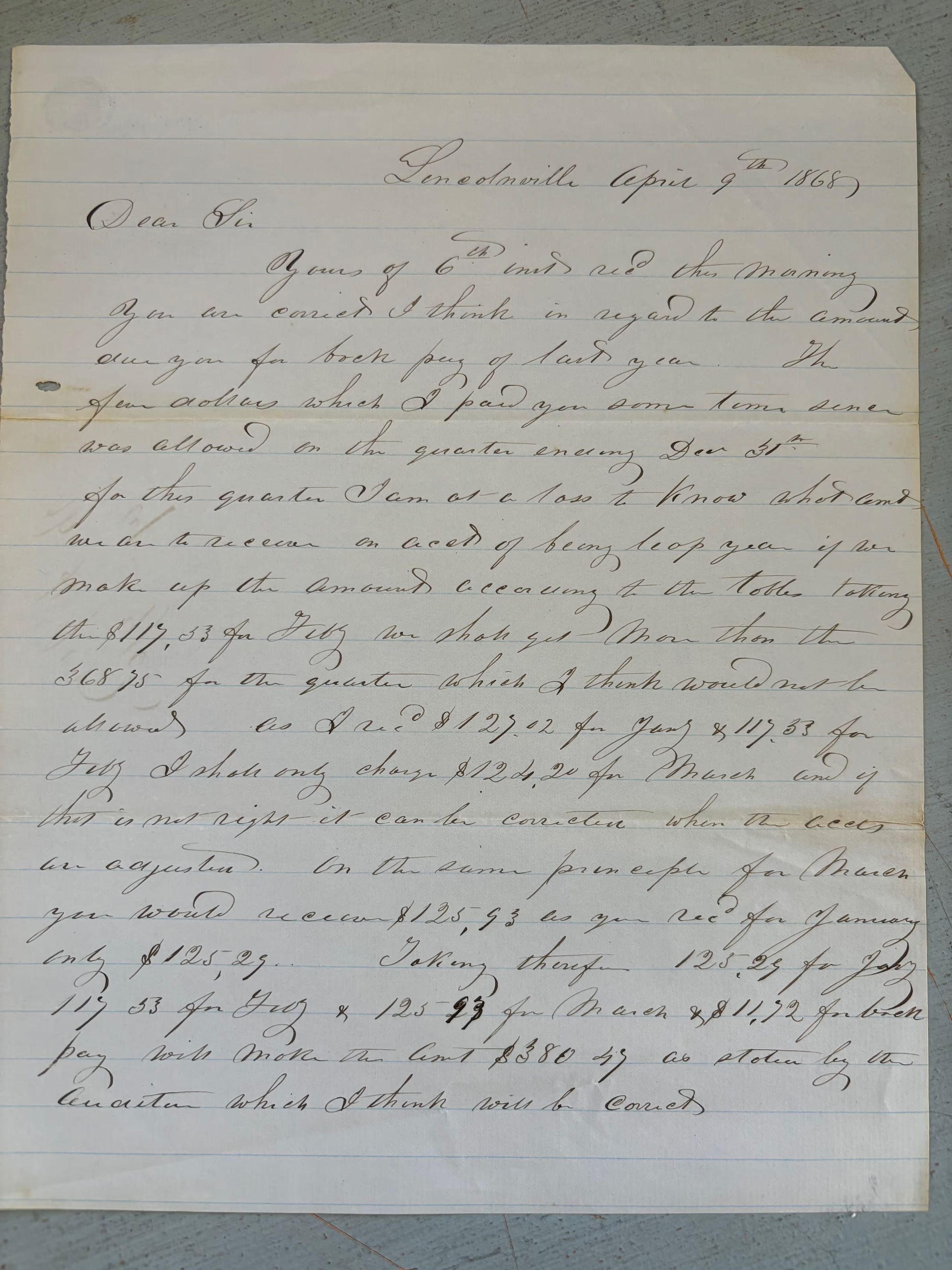 Letter written by unknown person discussing amount owed for back pay. A Mr. Joy is memtioned.