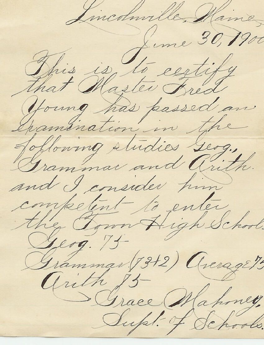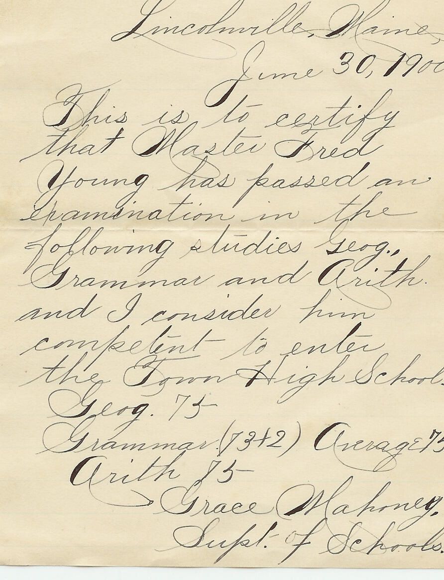 Handwritten letter to Fred Young from Superintendent of Schools Grace Mahoney certifying that Fred is ready to enter high school.Relationships