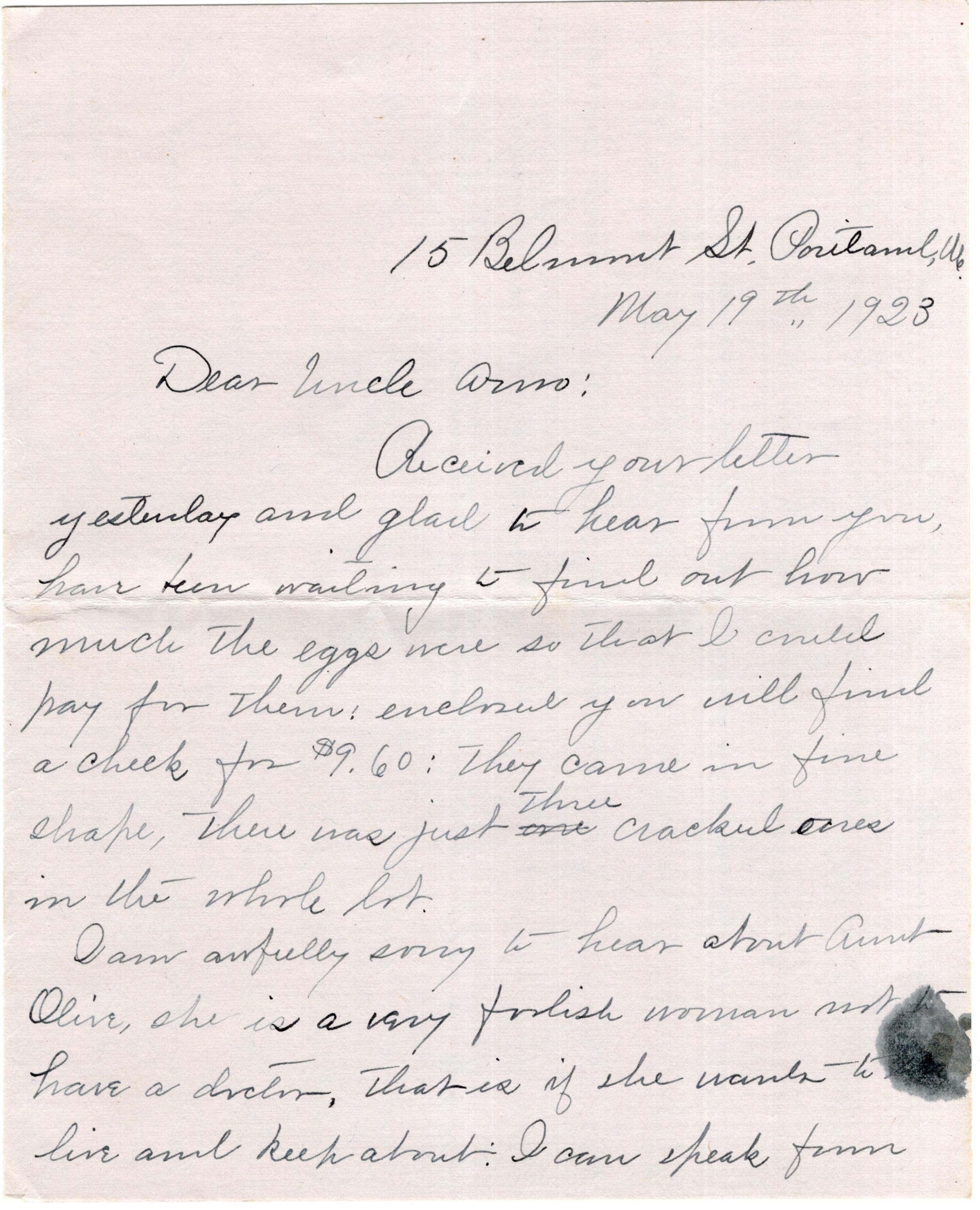 Knight Collection - 1923 Letter; Dated May 19; Written by Allie (Dyer) Smith to her uncle Arno Knight; she is the daughter of Fred and Emma Dyer, Olive's sister.Relationships