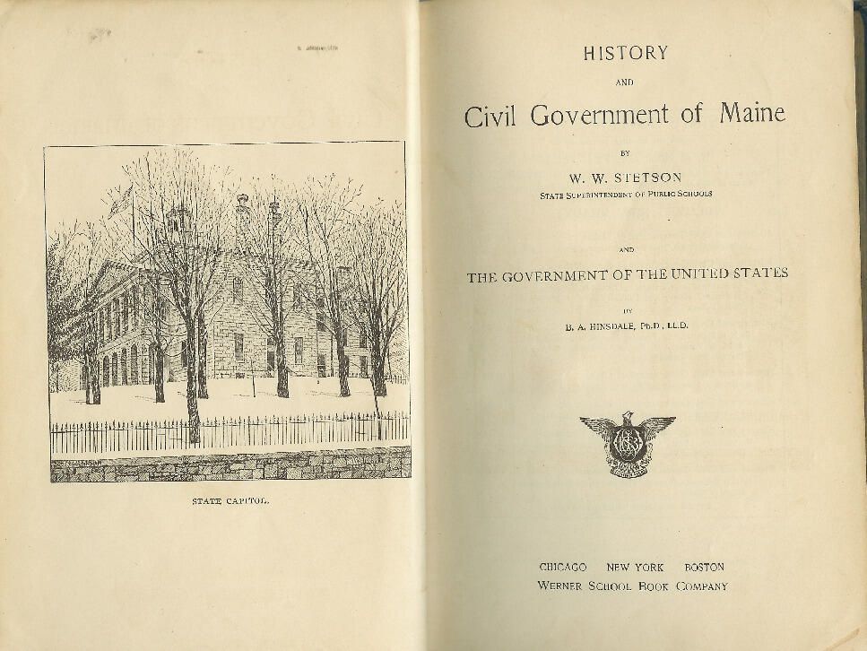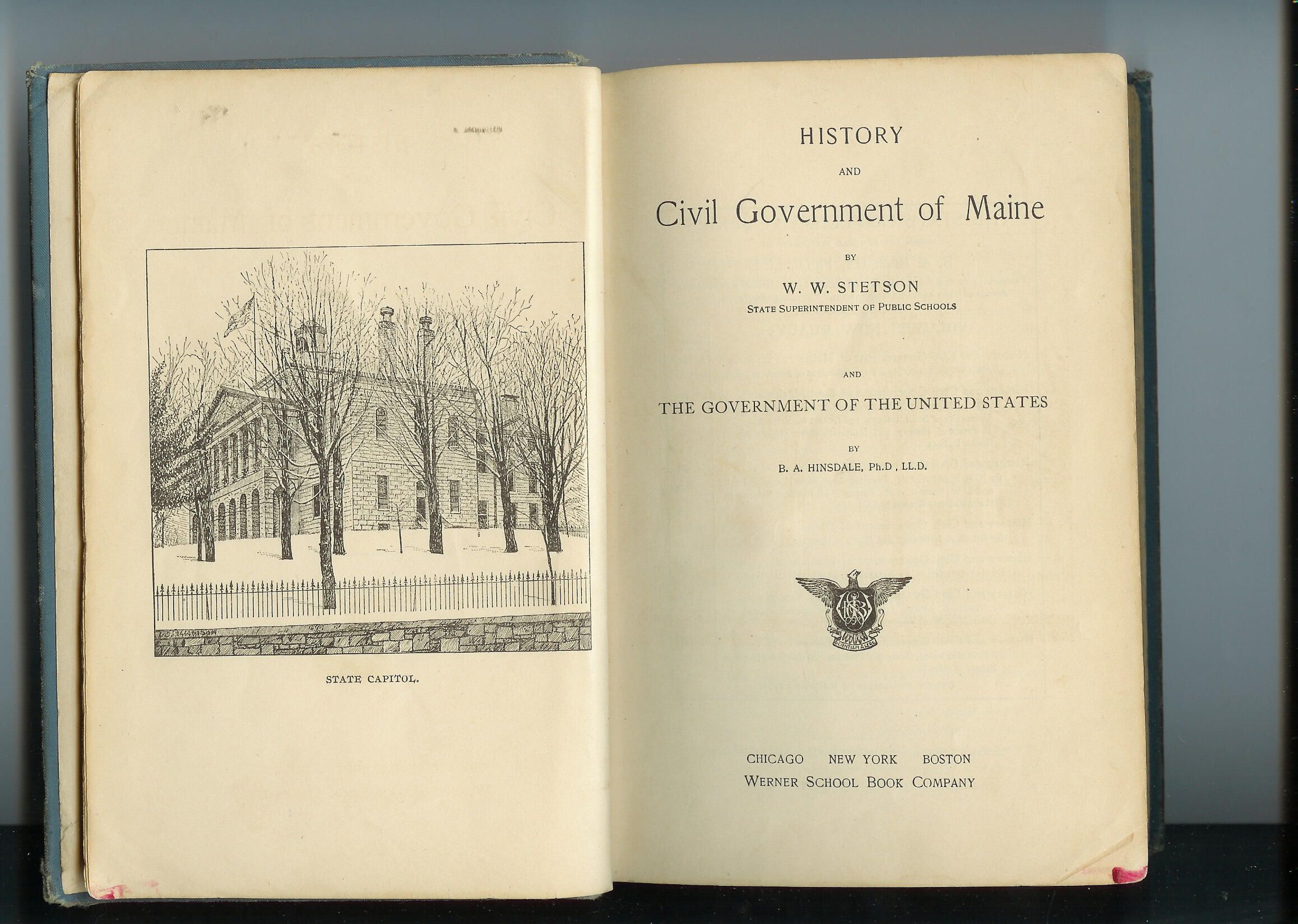 Hard cover book containing 340 indexed pages of the history and civil government of Maine and the government of the United States