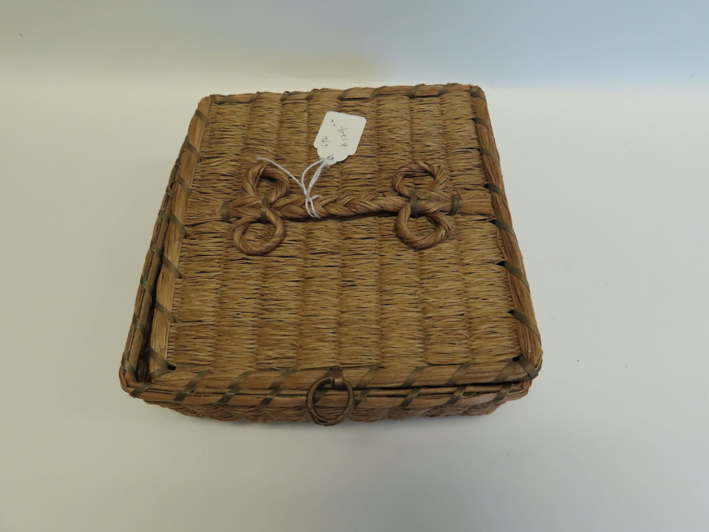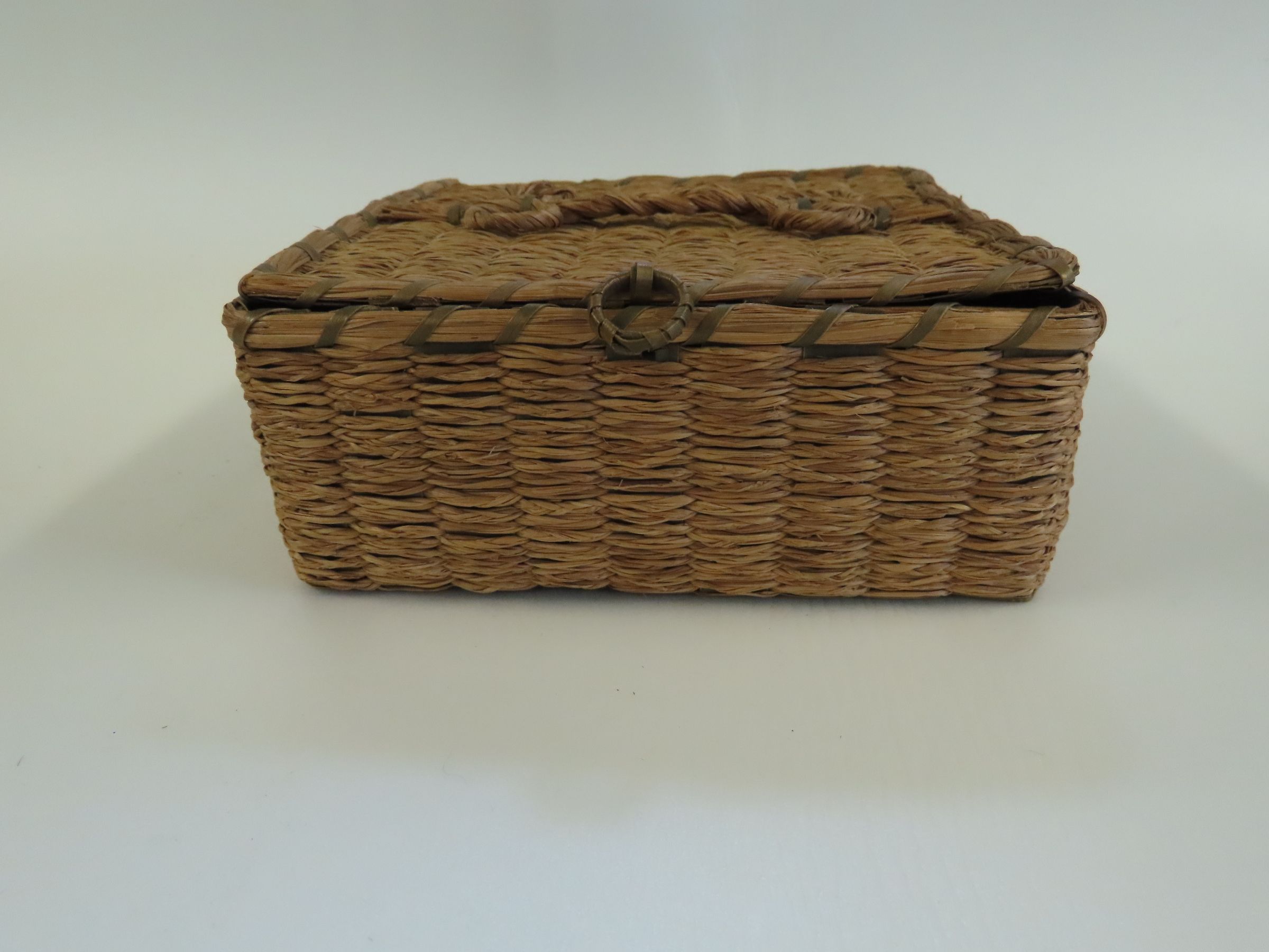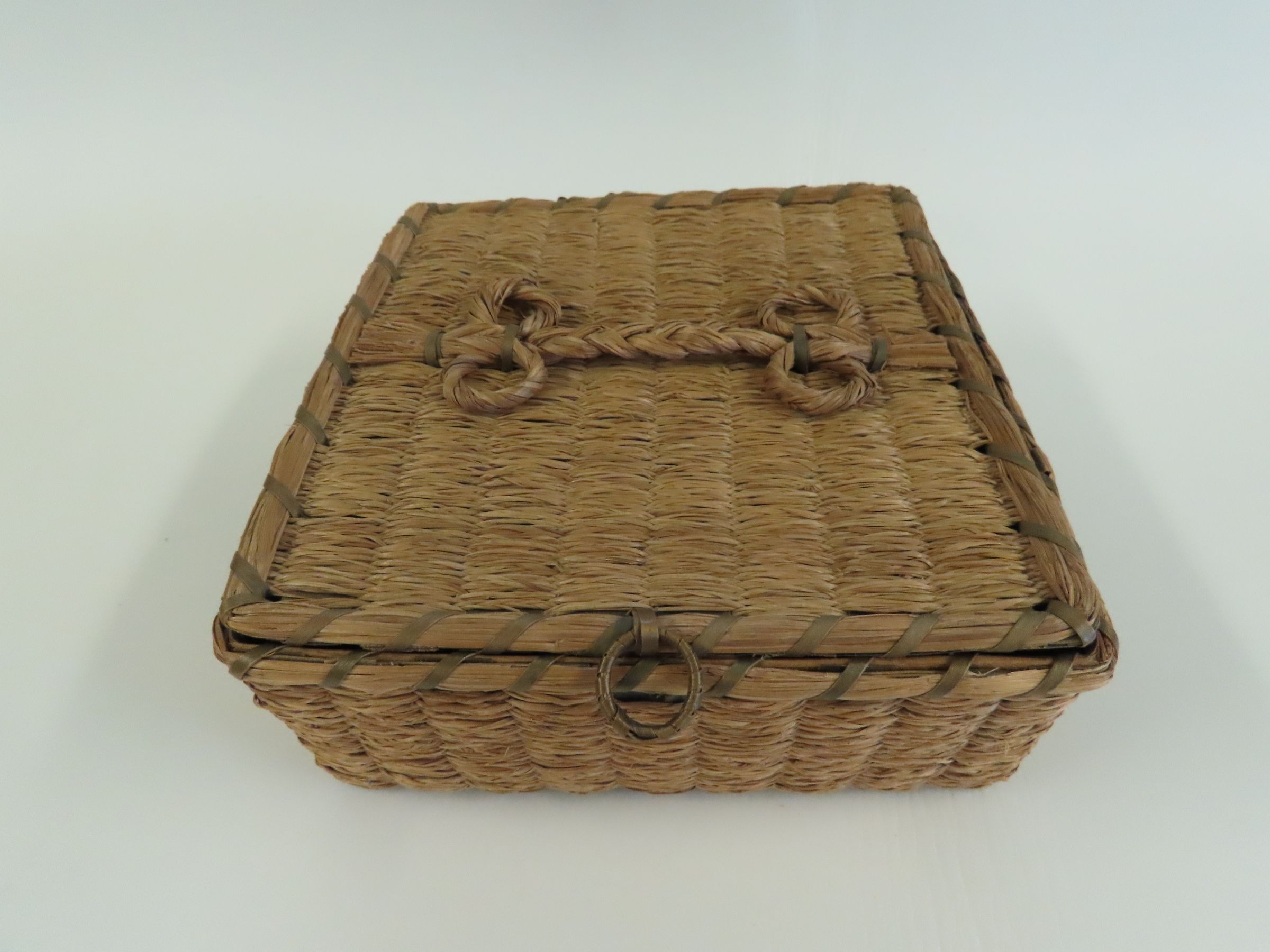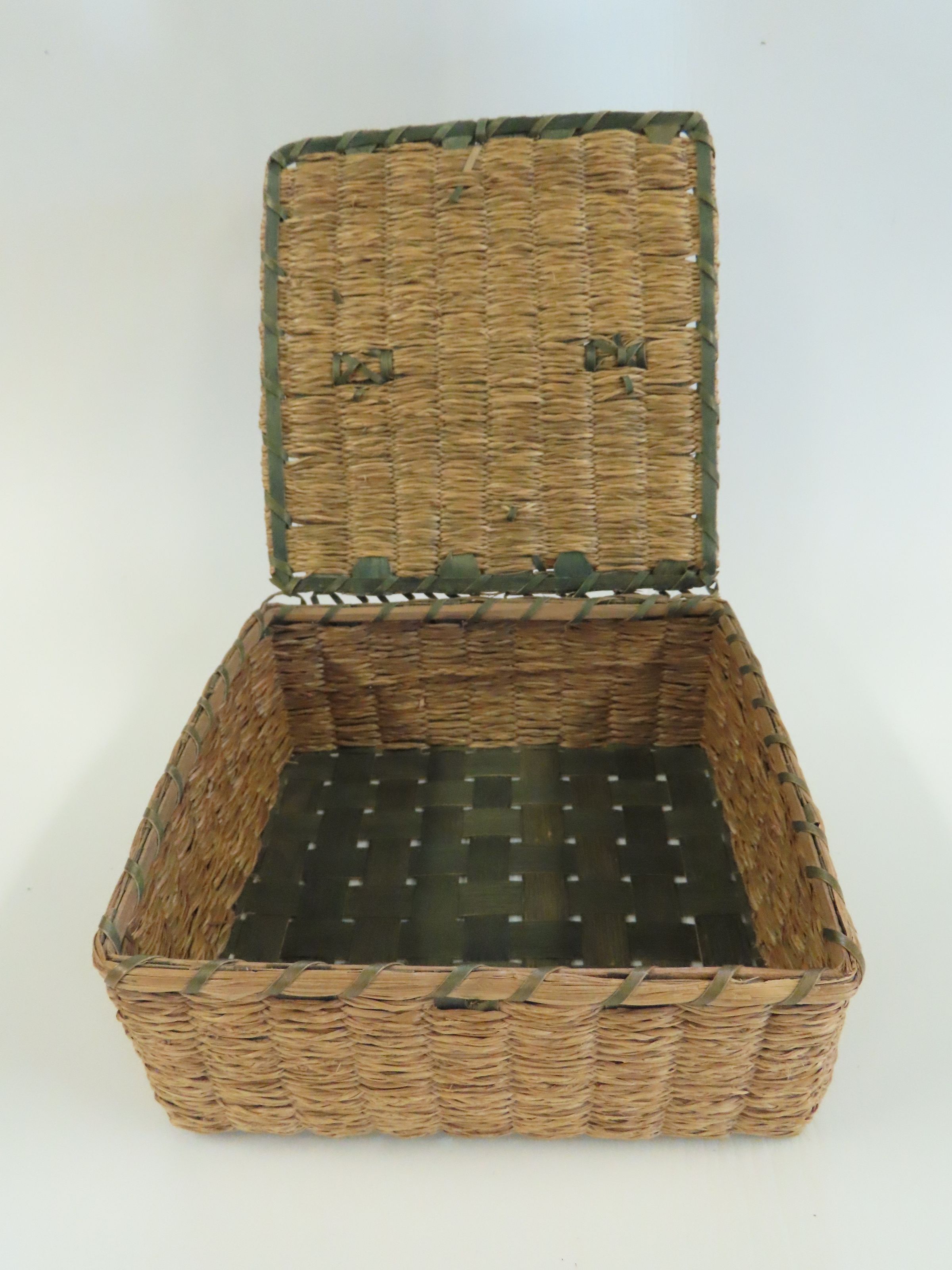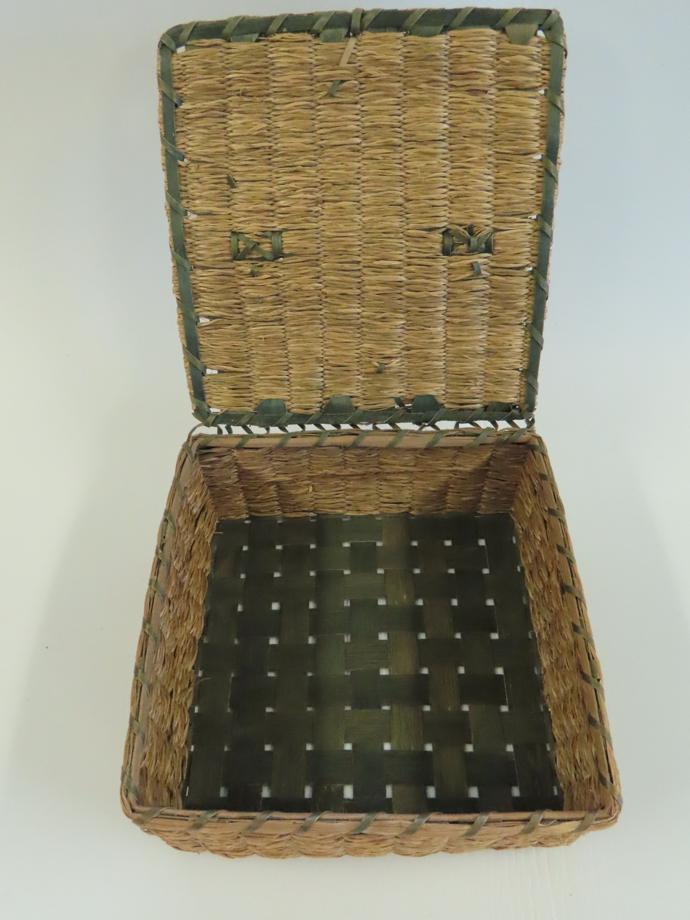 Penobscot Square Woven Basket with Hinged Lid made of Brown Ash & Sweetgrass, circa 1920