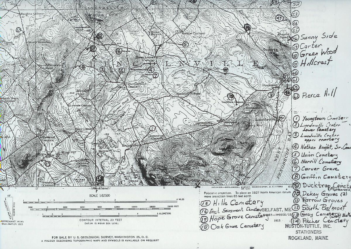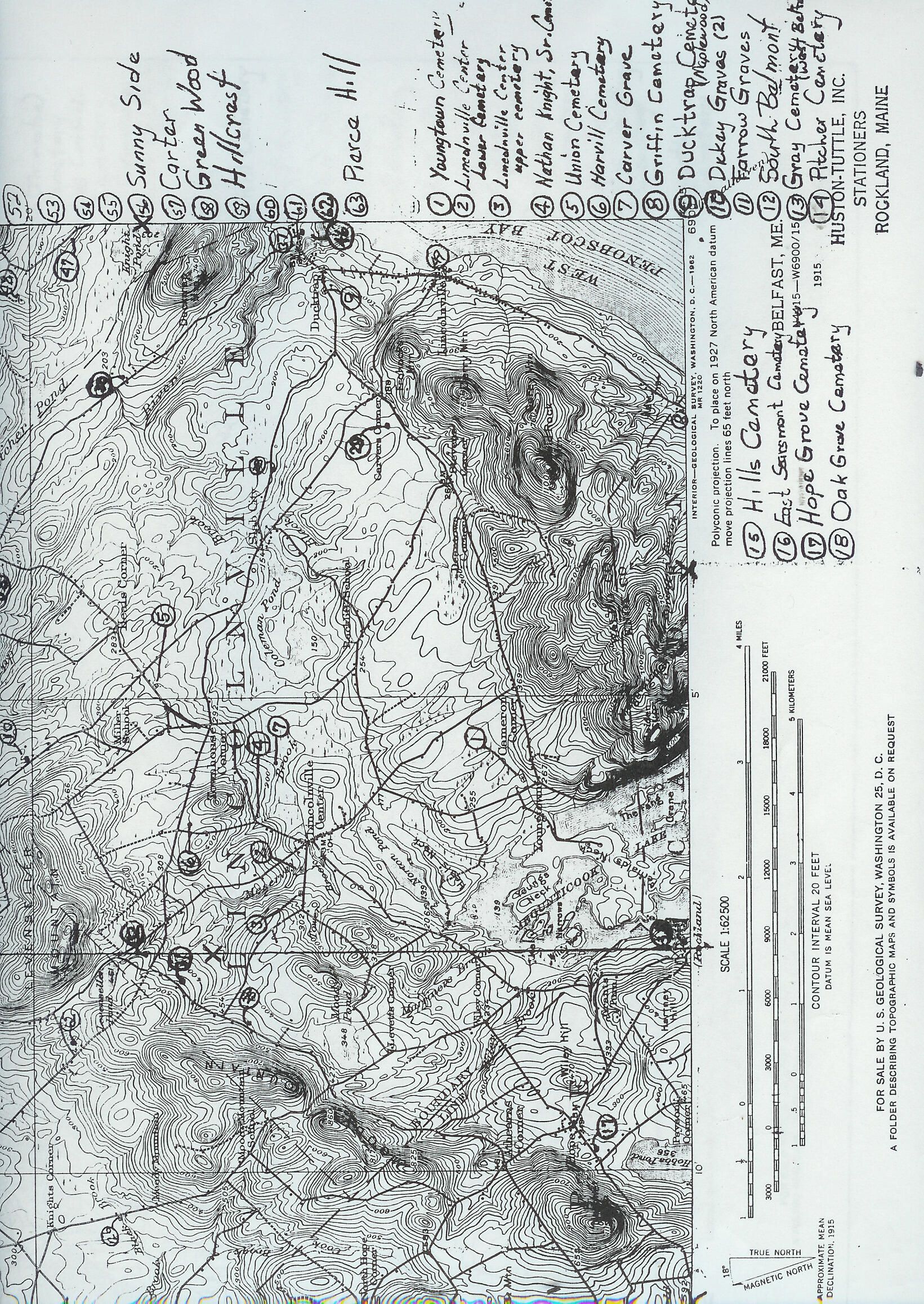 Two United States Geological Survey maps showing cemetery locations in Waldo and Knox Counties.