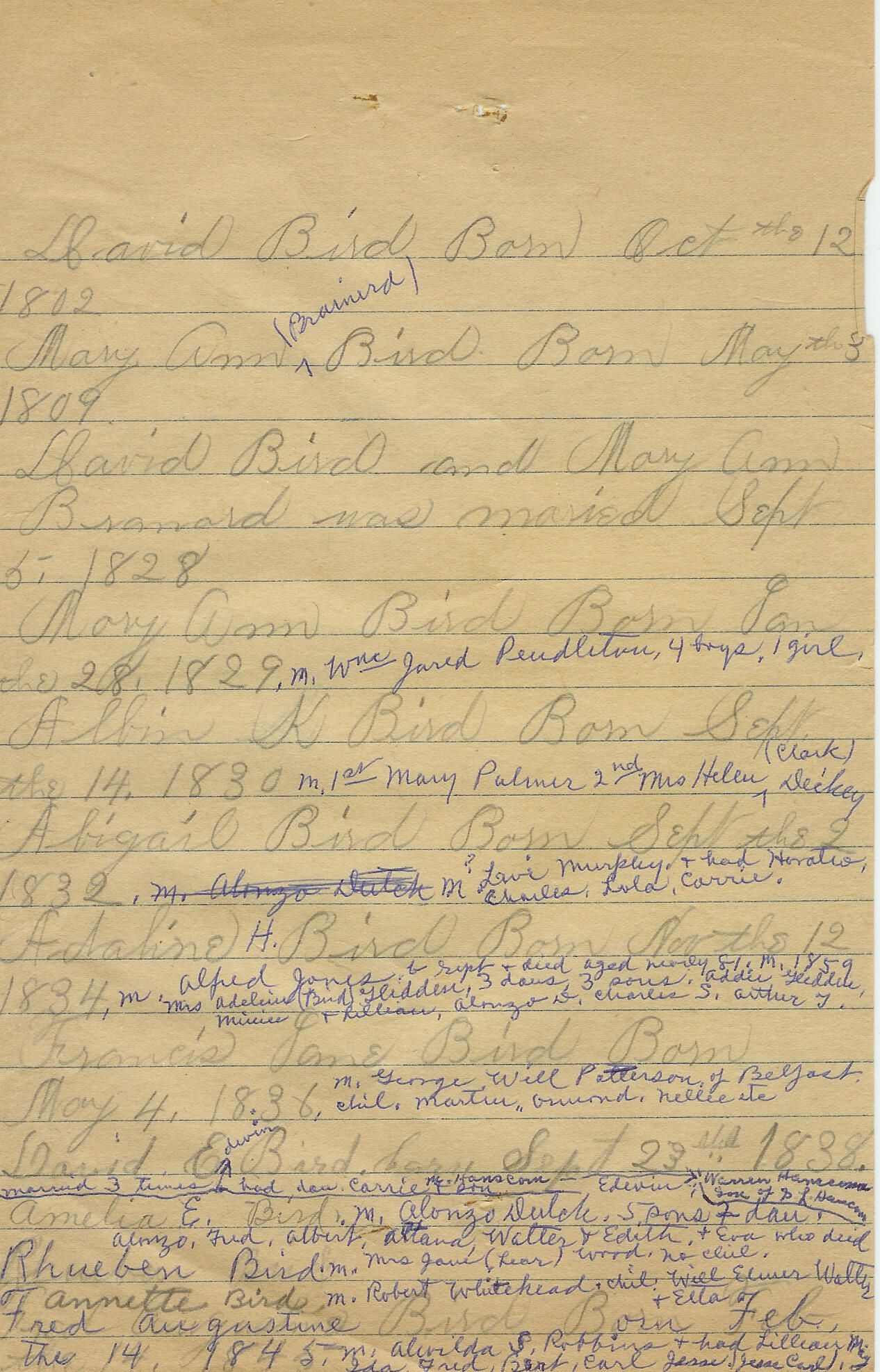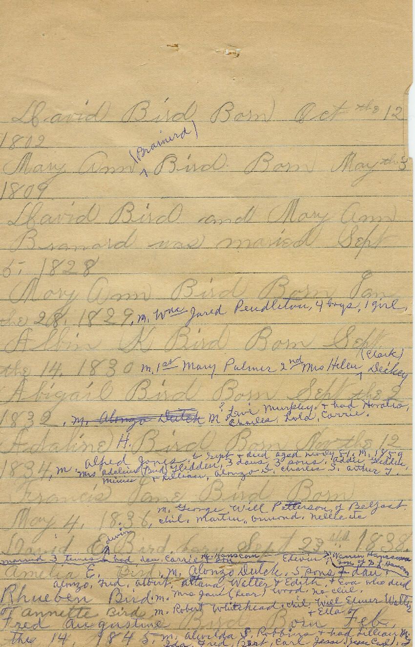 Partial geneaology of Bird family hand written by a family member.