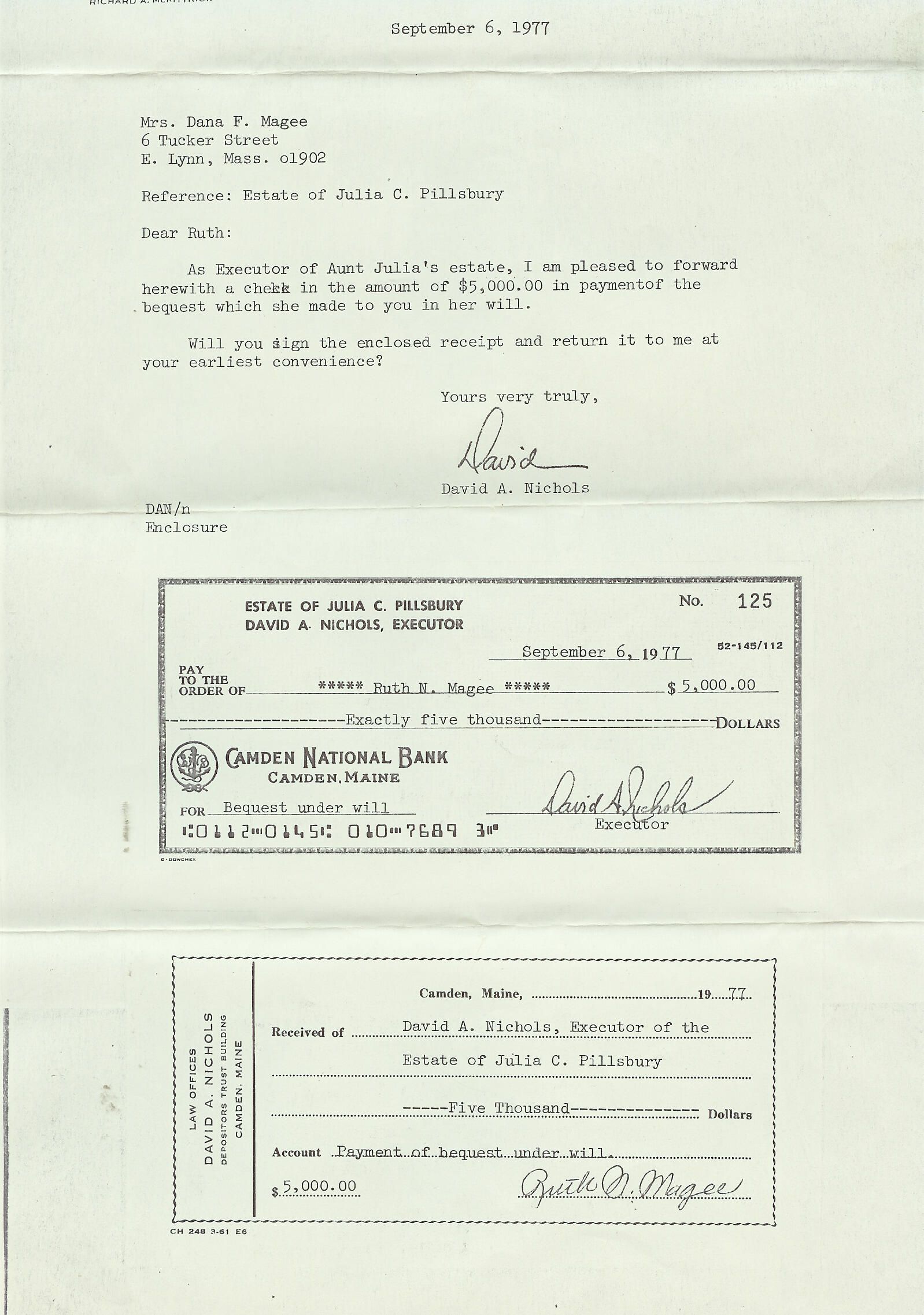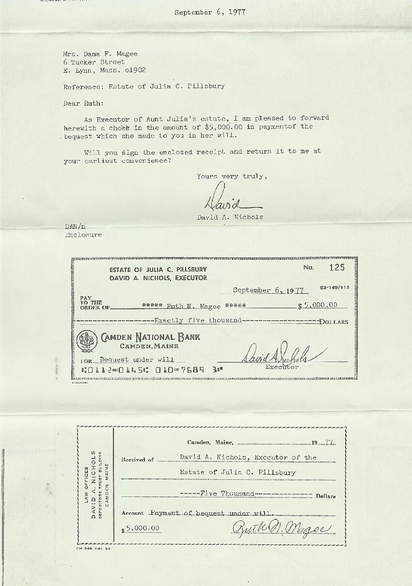 A photo copy of a letter dated Sept. 6, 1977 to Ruth Magee which included a check for $5,000, a bequest from Julia Crehore--"Aunt Julia"-- to Ruth.