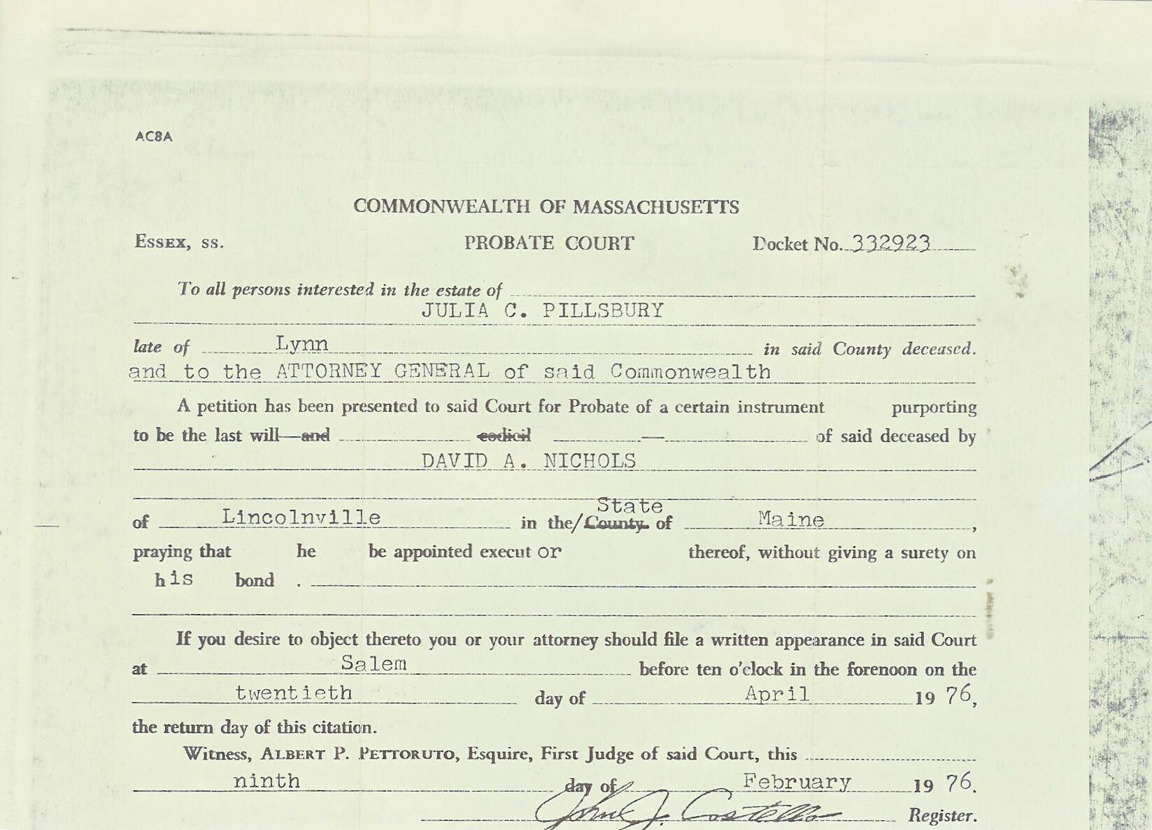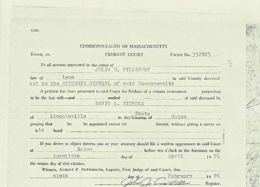 form from Commonwealth of Massachusetts Probate Court requesting that David A. Nichols be appointed Executor of Julia C. Pillsbury's willRelationships