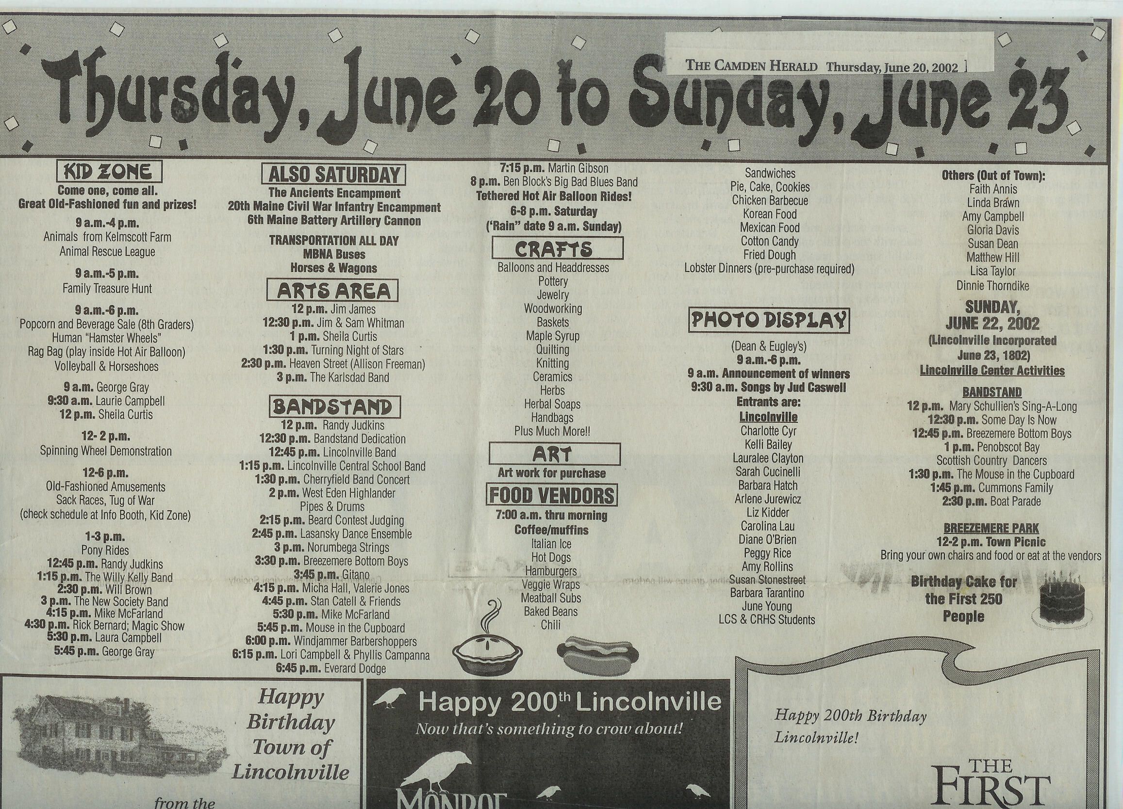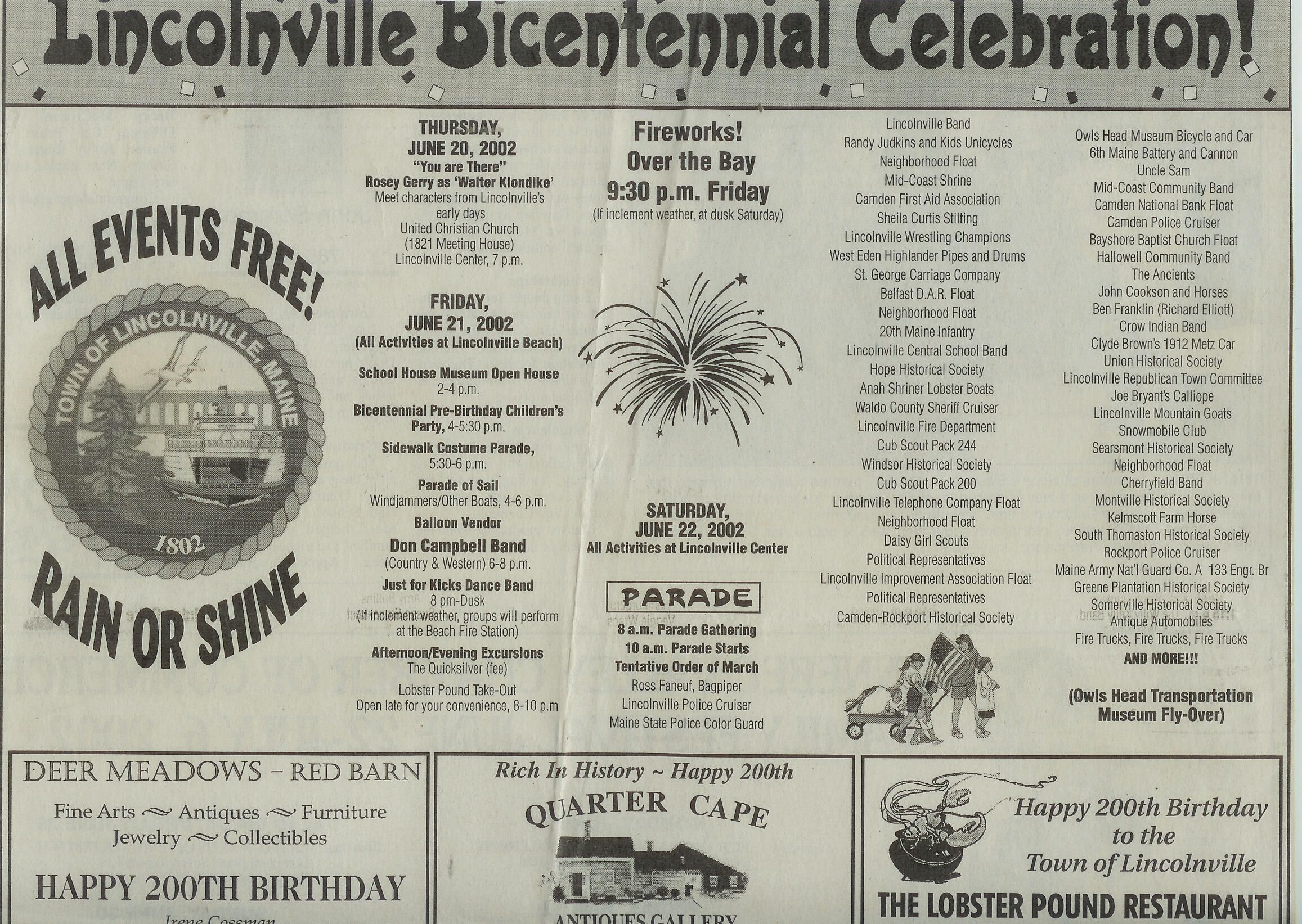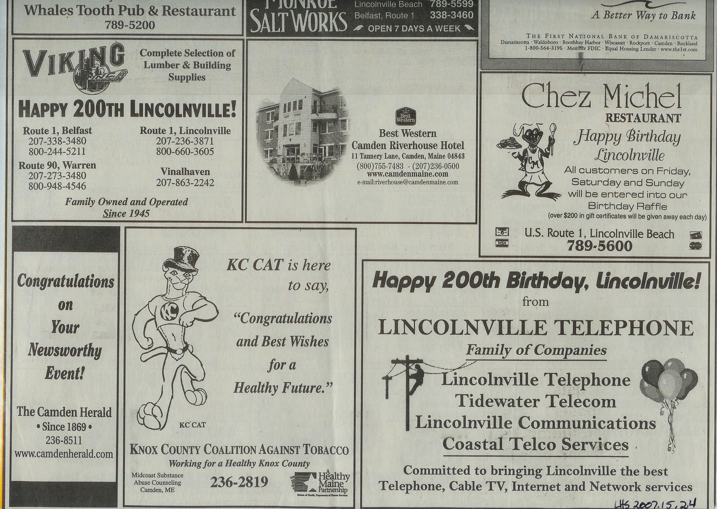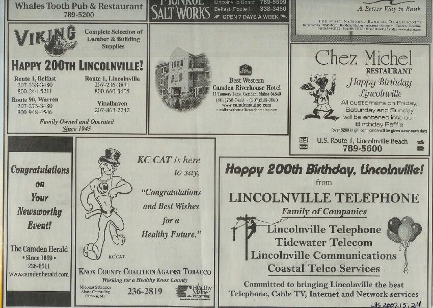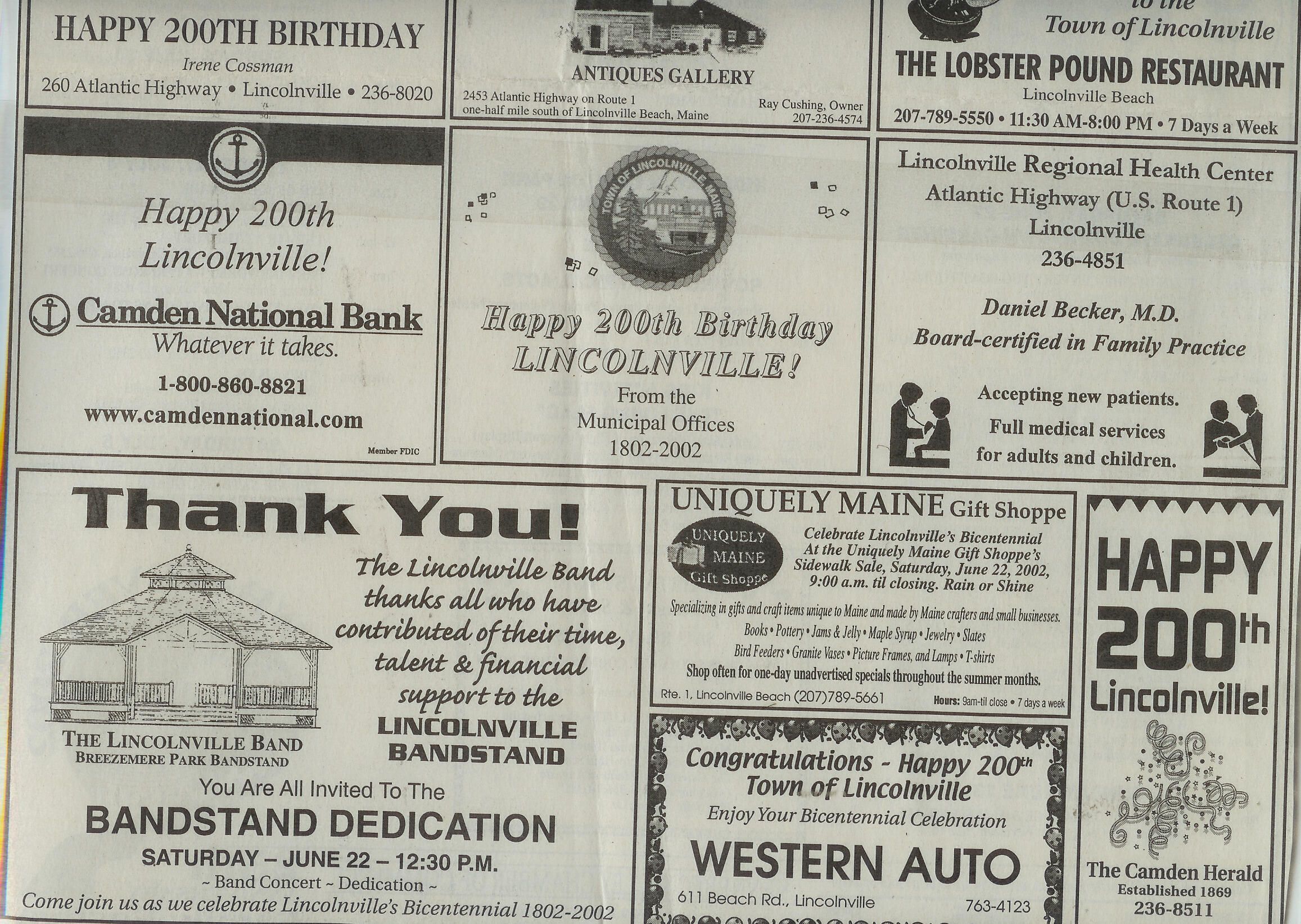 two page newspaper ad for Bicentennial, sponsored by local businesses ran in June 20, 2002 Camden Herald laminated