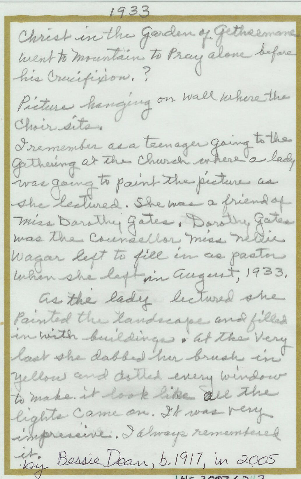 1 page handwritten story of a painting that still hangs in the sanctuary at United Christian Church written by Bessie Dean in 2005.