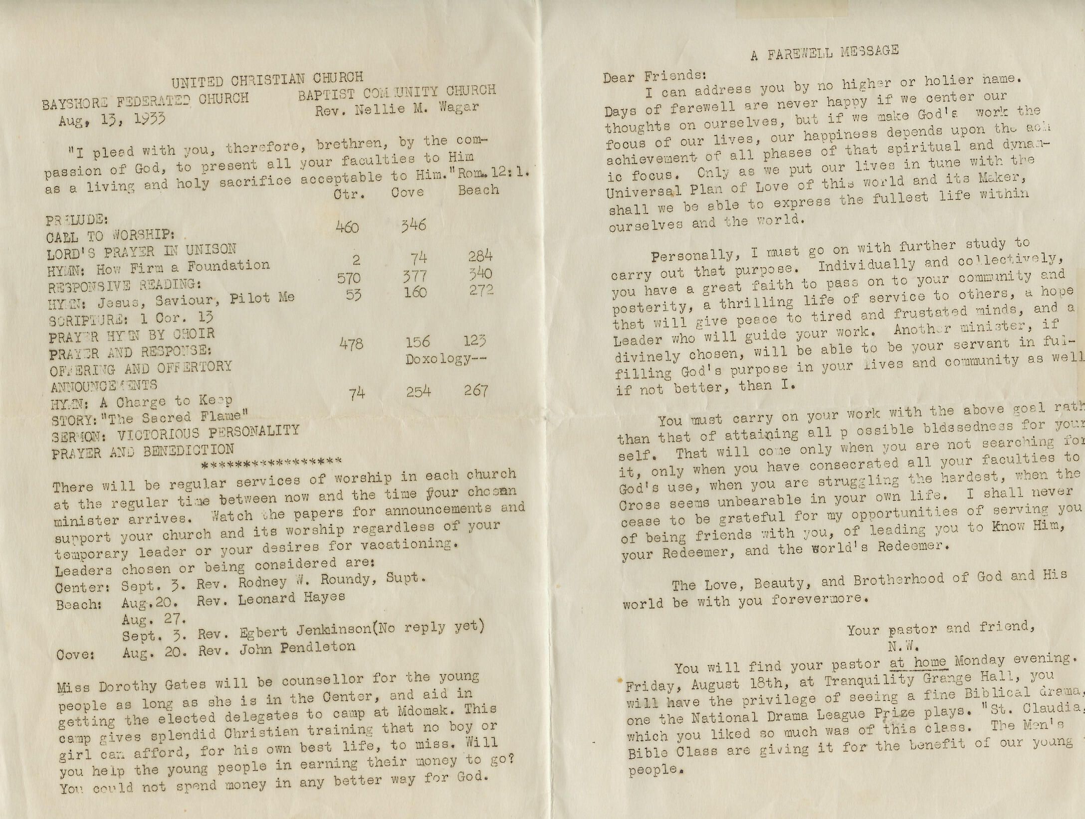 Church bulletin, Aug. 13, 1933
