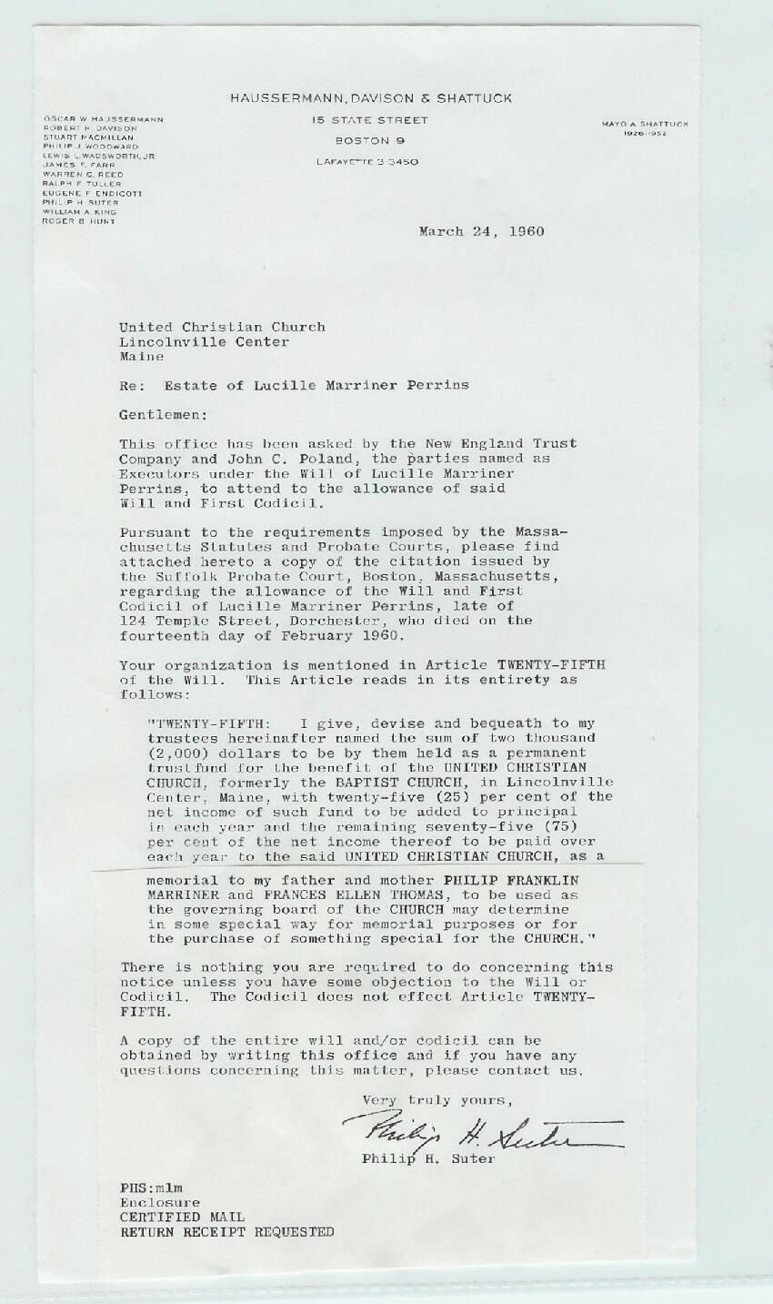 letter from Haussermann, Davison & Shattuck law firm re the estate of Lucille Marriner Perrins re a bequest of $2000 to UCC as a memorial to her father and mother Philip Franklin Marriner and Frances Ellen ThomasRelationships